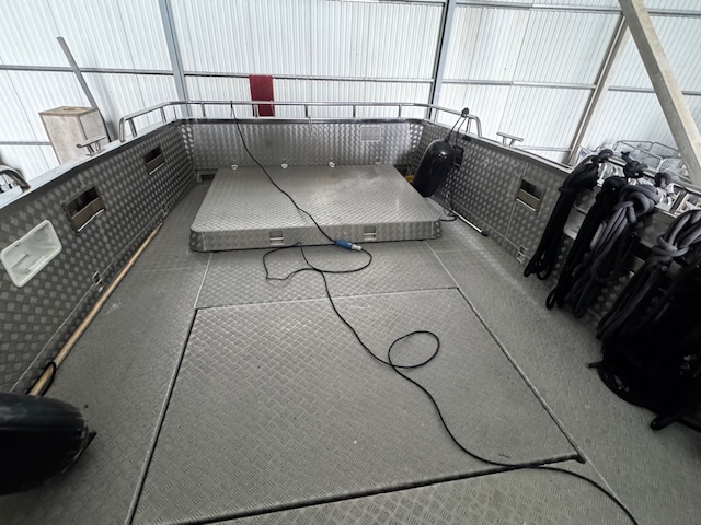 Akterut finns en rymlig plattform med dragkrok och Quick Release-funktion, vilket gör båten väl anpassad även för arbetsuppdrag eller transporter. Den stora öppna lastytan i aluminium, ungefär fyra meter lång, har en rejäl förvaringslucka i mitten. Midskepps finns dessutom ett enormt stuvutrymme under durken – perfekt för längre turer eller mer omfattande packning.