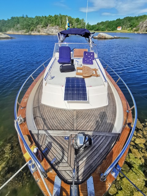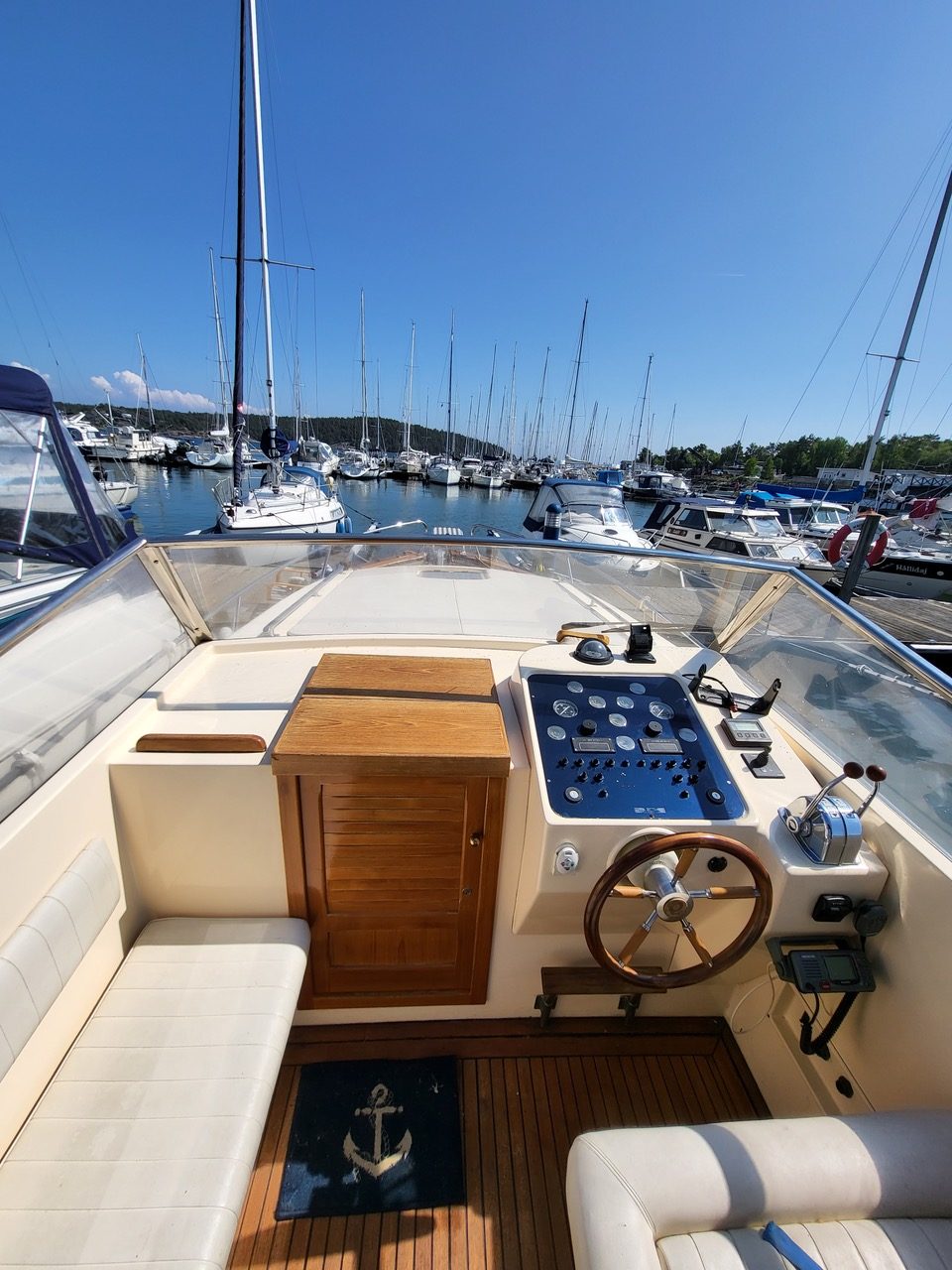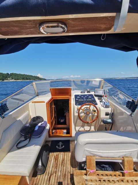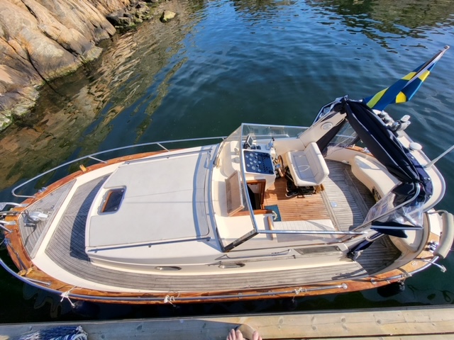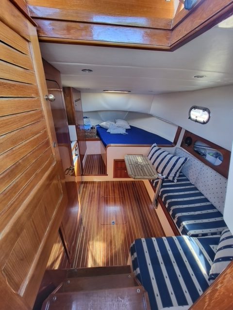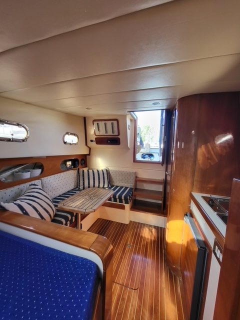 Under däck finns en välplanerad kabin som gör det möjligt att stanna ute över natten. Interiören präglas av klassiska materialval och en varm atmosfär som förstärker känslan av italiensk båtkultur och komfort. Båten lämpar sig lika väl för lugna dagsturer i skärgården som för kortare weekendutflykter.