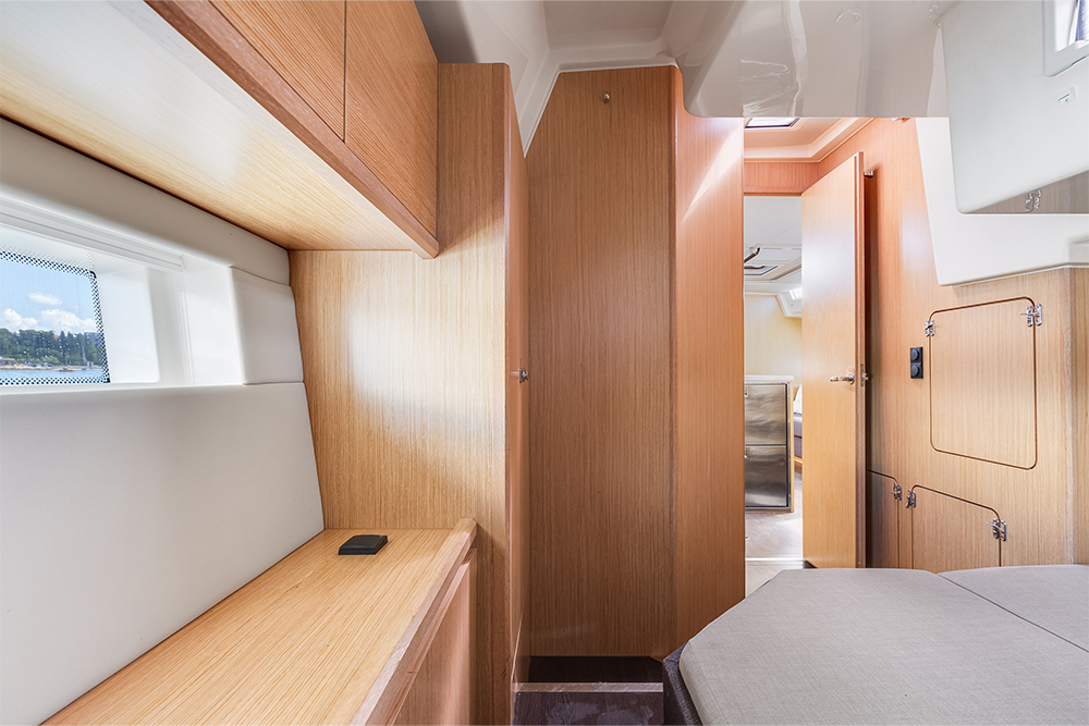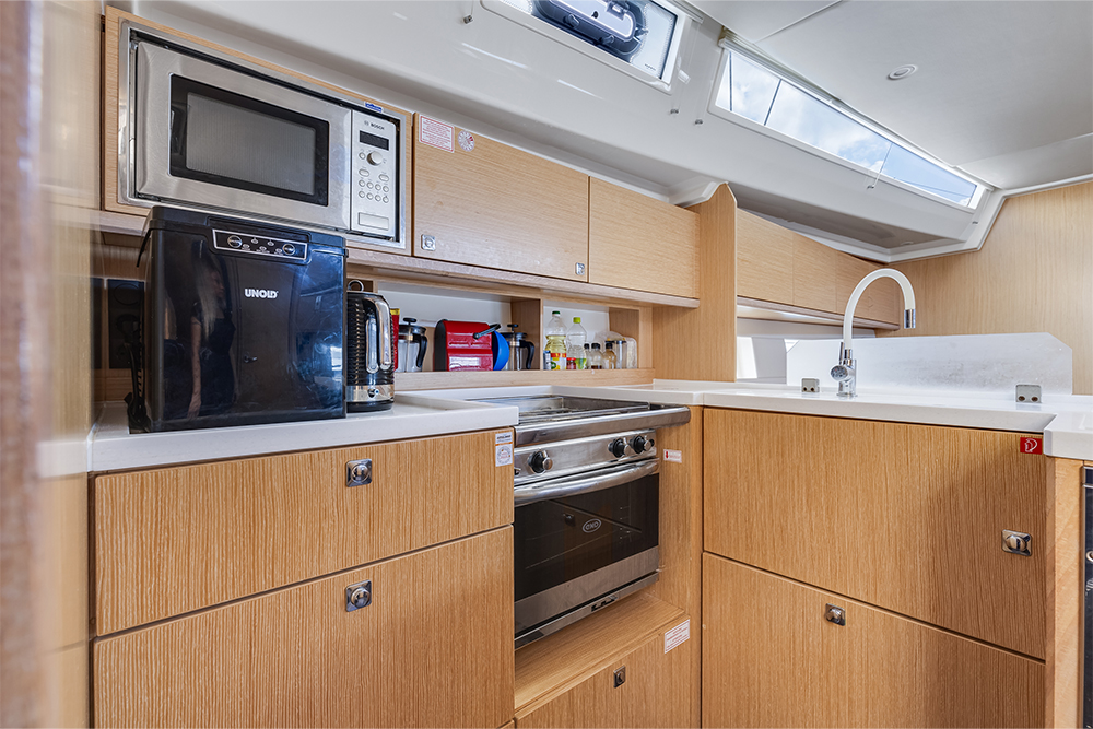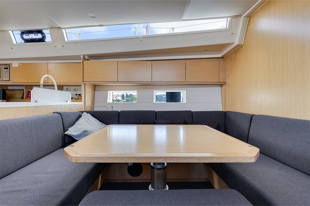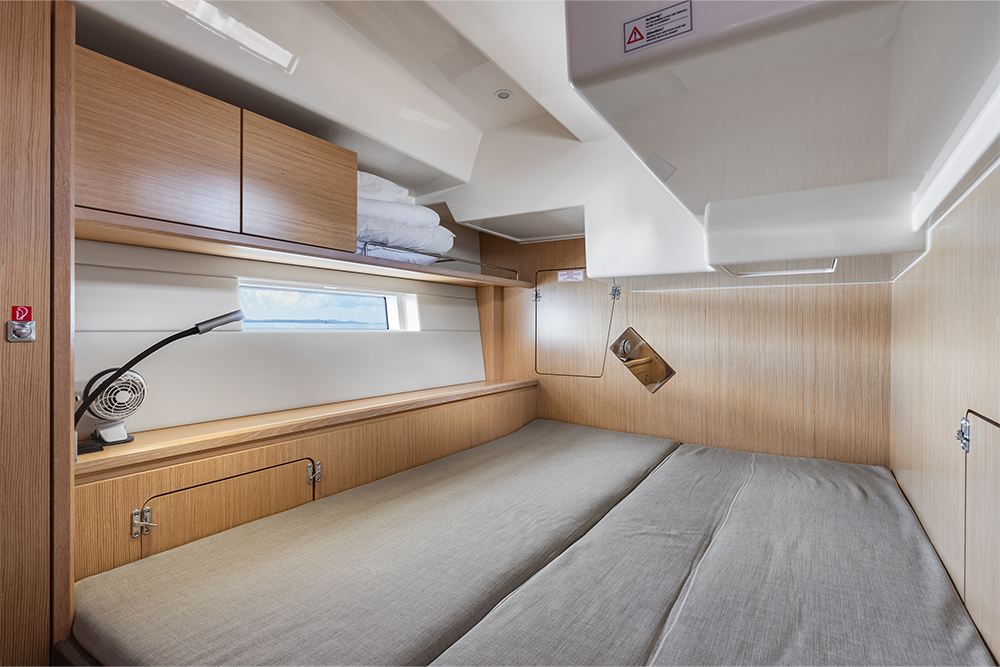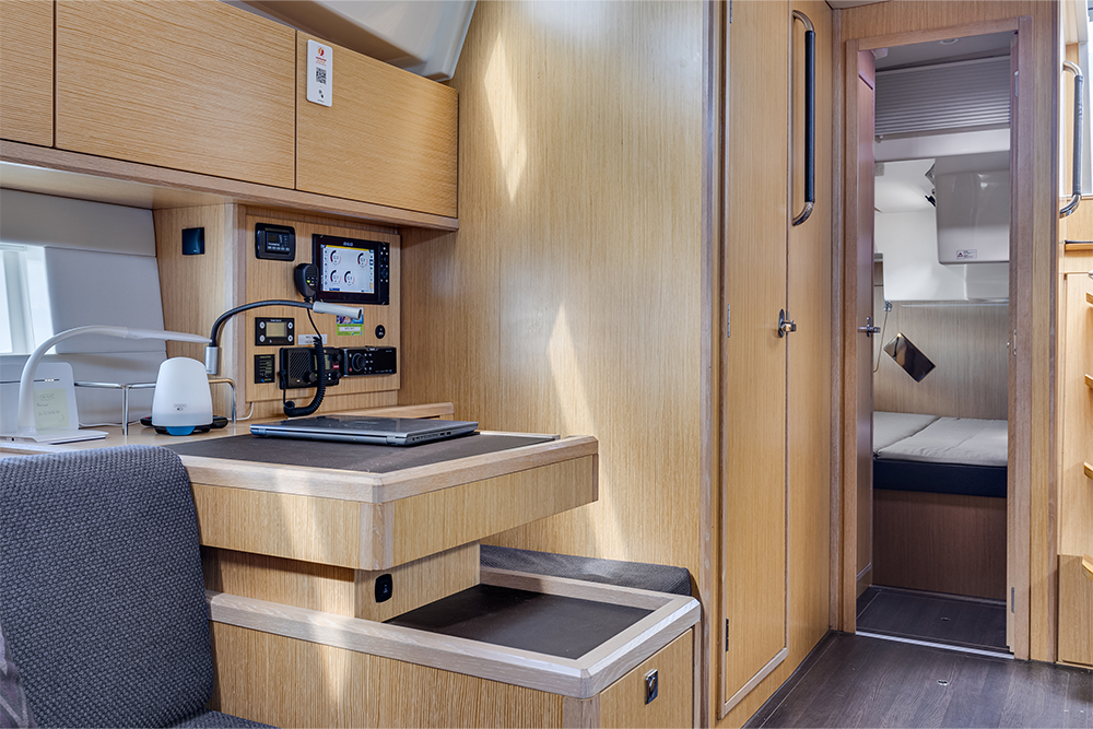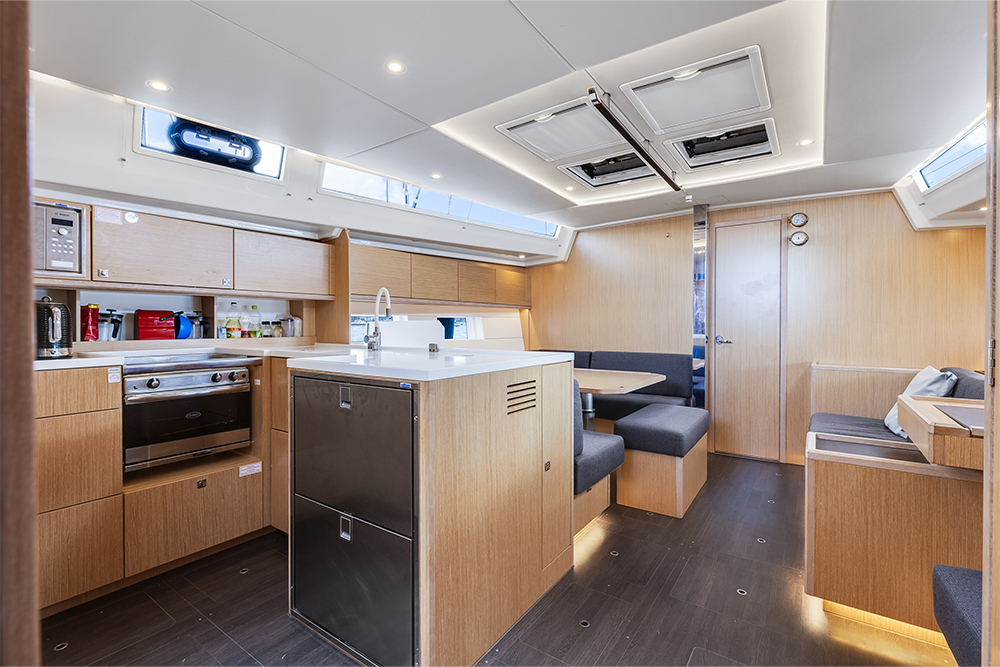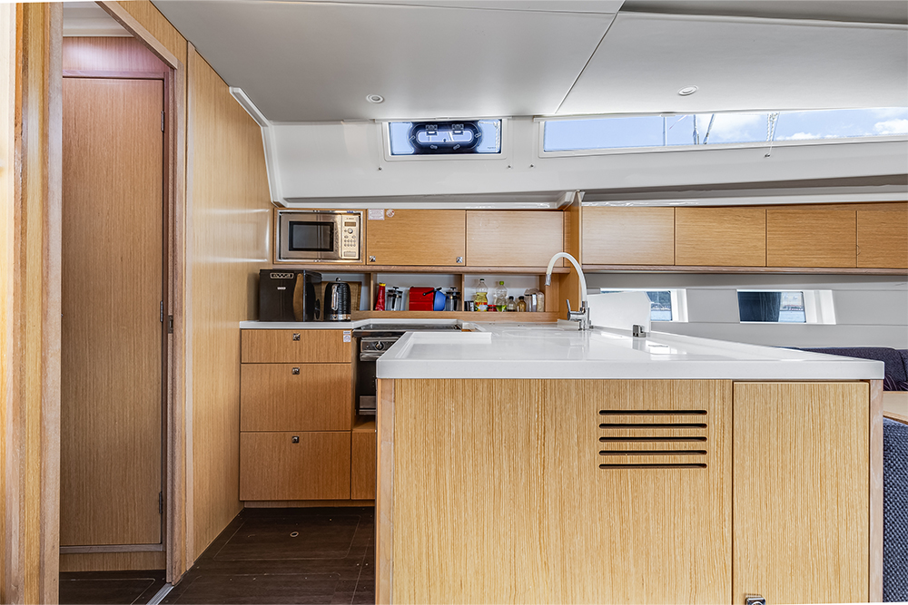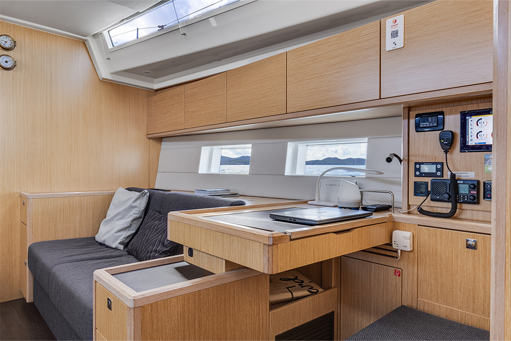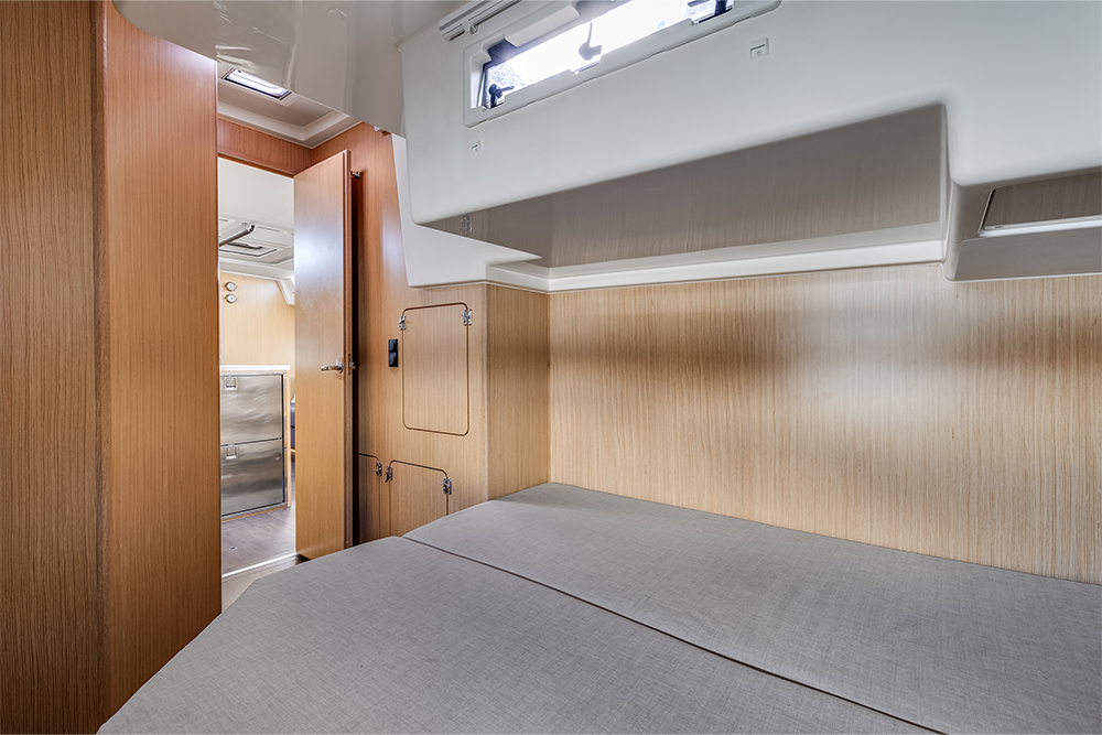 Seglingen görs enkel och säker tack vare Seldén rullmast, självslående fock och elektriska vinschar. Bogpropeller underlättar manövrering i hamn, medan den stora sittbrunnen med dubbla bord, sittbrunnskuddar och elektriskt nedfällbar badplattform bjuder in till socialt umgänge och badliv. Interiören är ljus och välplanerad med tre kabiner, alla med egna badrum. Masterhytten i fören är en privat svit med rymlig dubbelkoj och gott om garderober, medan de två akterhytterna erbjuder gästerna generösa utrymmen. En separat skippercabin i fören används idag som förråd men kan enkelt nyttjas som extra hytt vid behov.