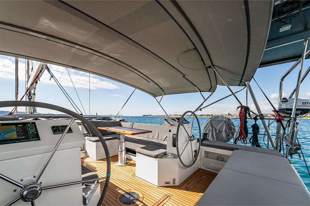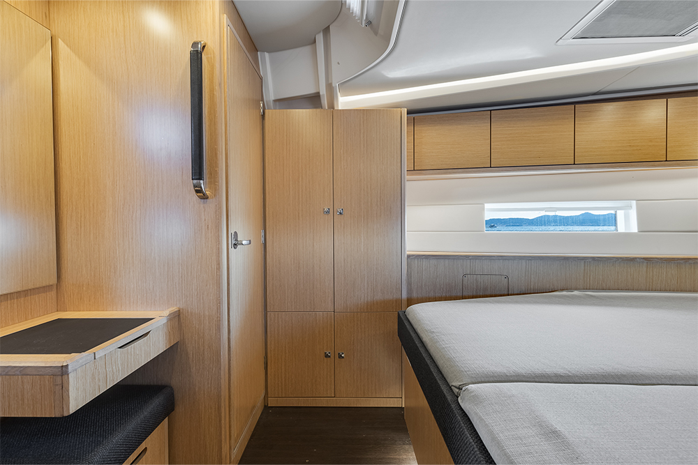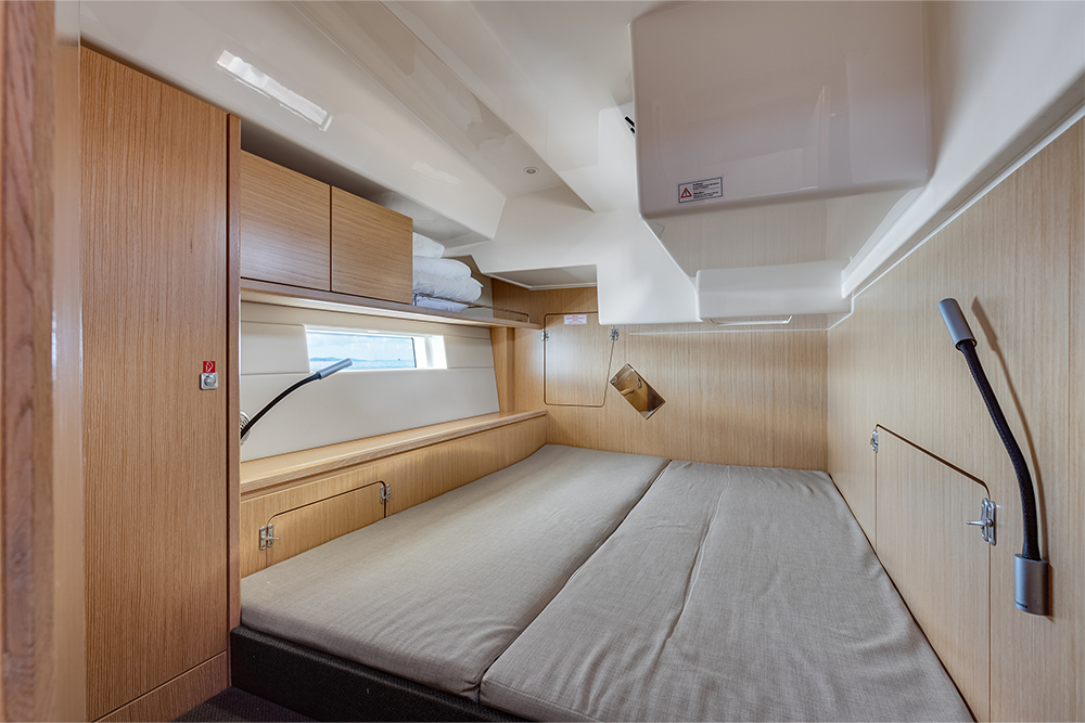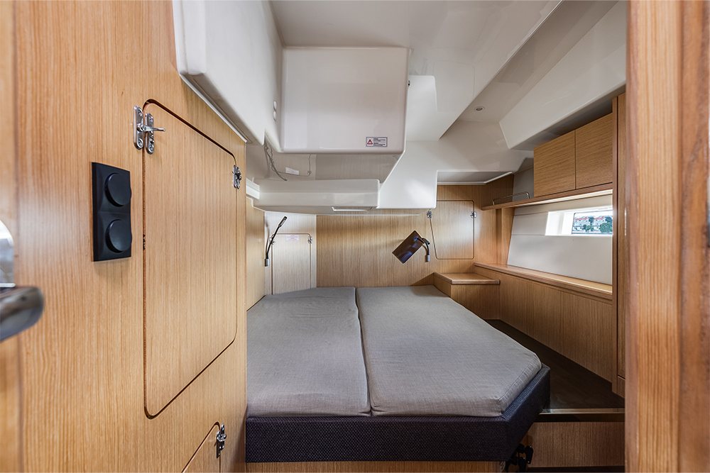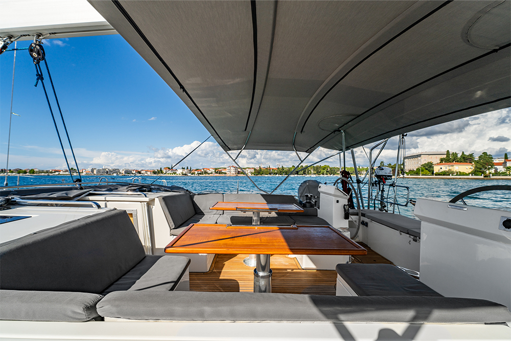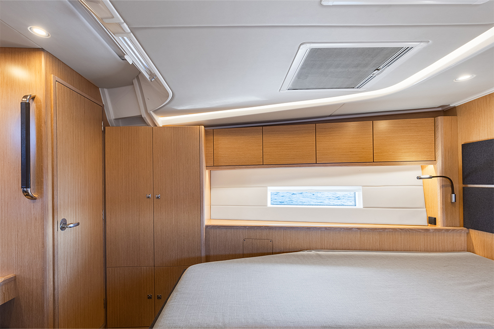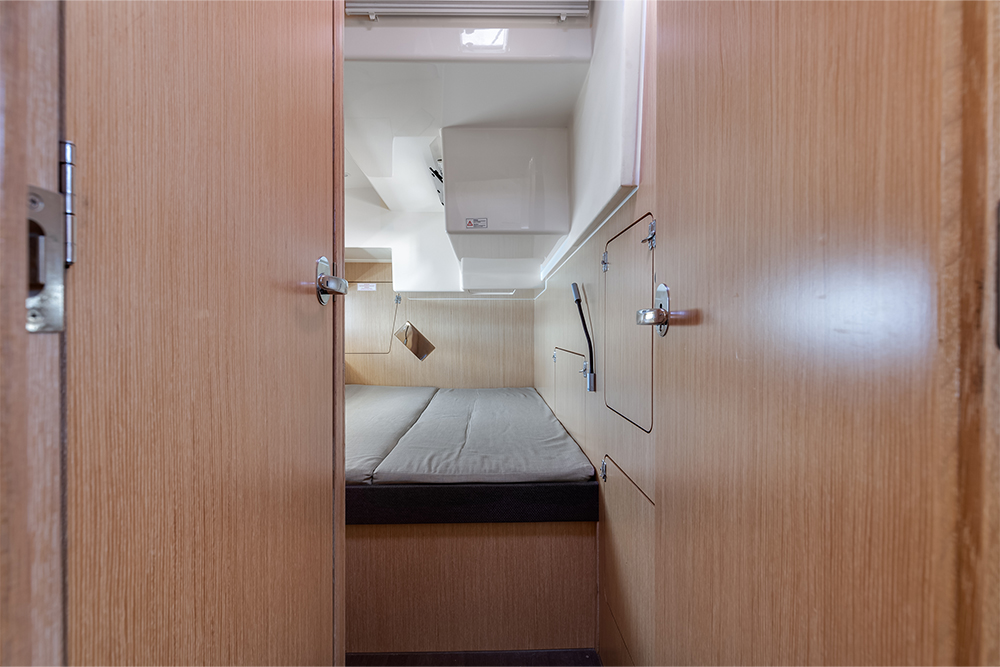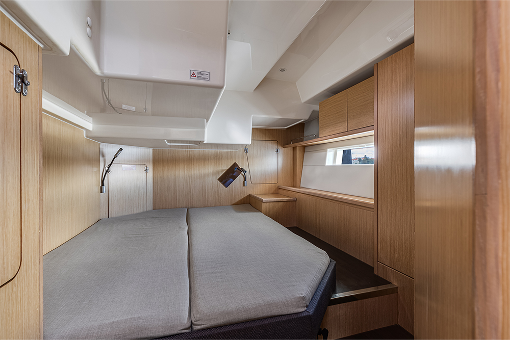 Seglingen görs enkel och säker tack vare Seldén rullmast, självslående fock och elektriska vinschar. Bogpropeller underlättar manövrering i hamn, medan den stora sittbrunnen med dubbla bord, sittbrunnskuddar och elektriskt nedfällbar badplattform bjuder in till socialt umgänge och badliv. Interiören är ljus och välplanerad med tre kabiner, alla med egna badrum. Masterhytten i fören är en privat svit med rymlig dubbelkoj och gott om garderober, medan de två akterhytterna erbjuder gästerna generösa utrymmen. En separat skippercabin i fören används idag som förråd men kan enkelt nyttjas som extra hytt vid behov.