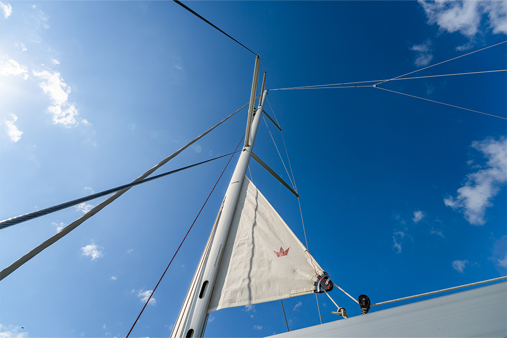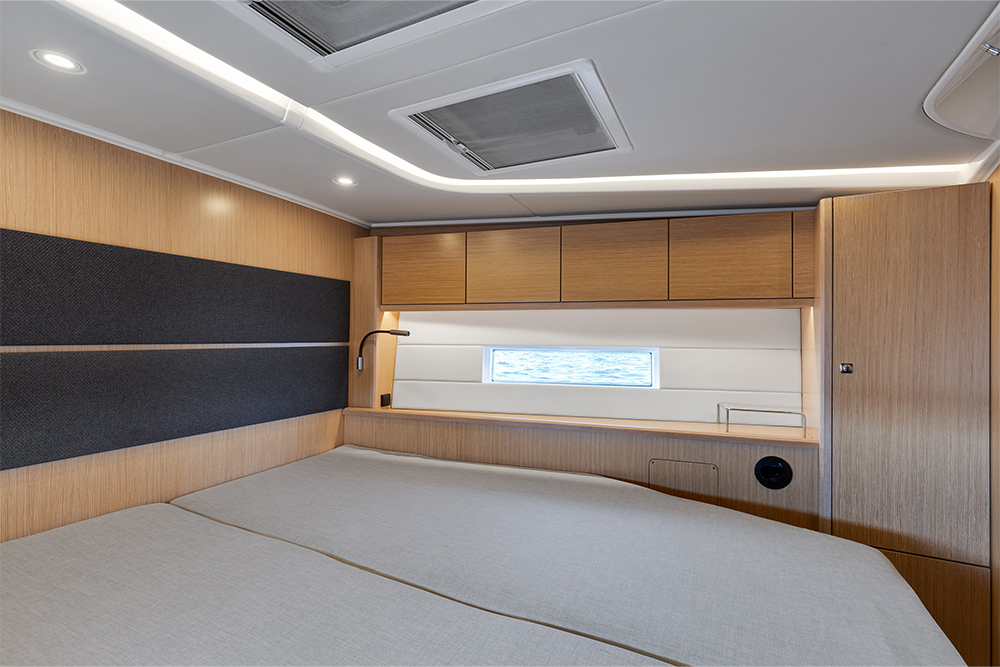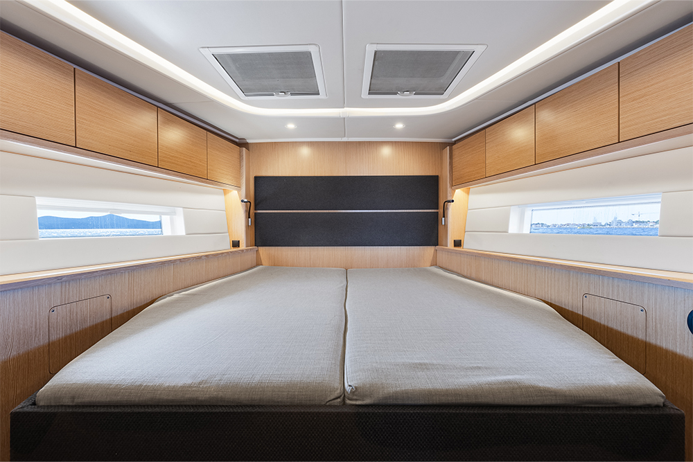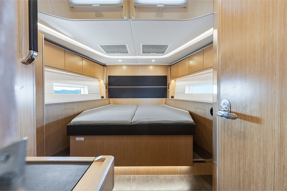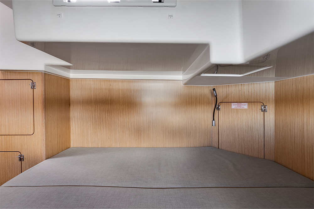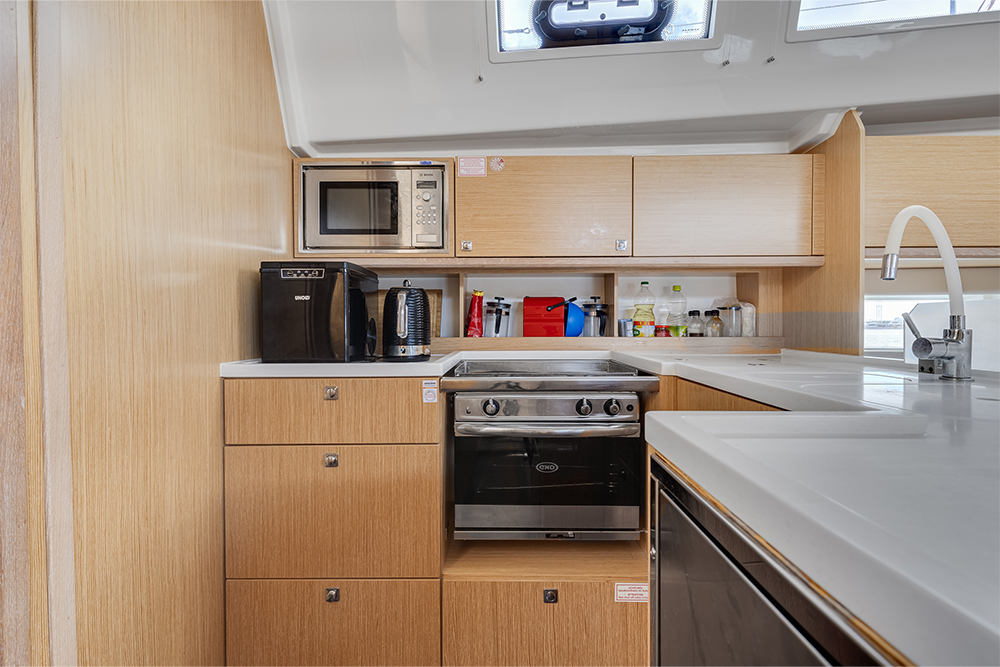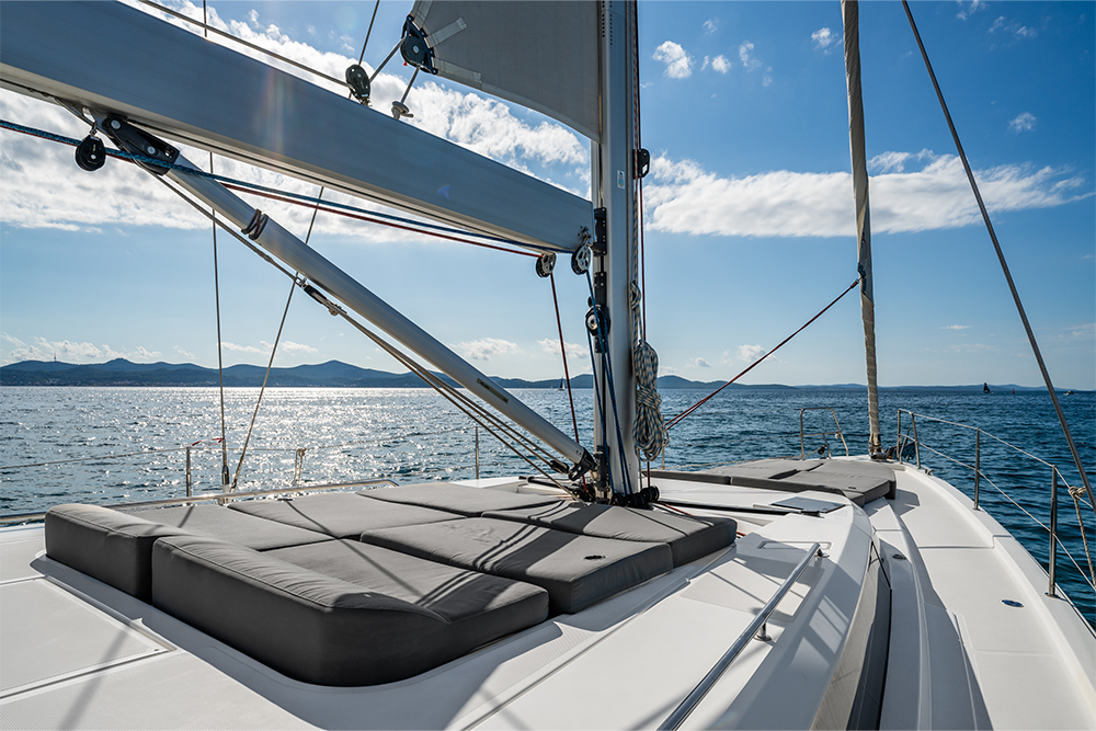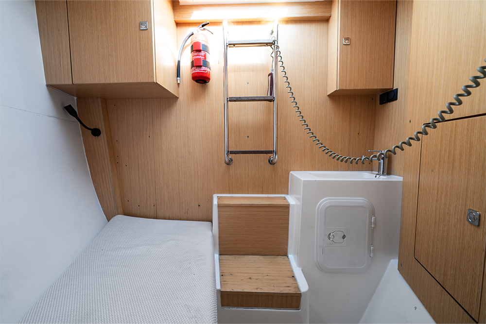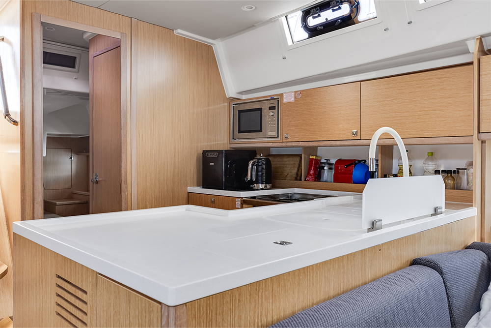Seglingen görs enkel och säker tack vare Seldén rullmast, självslående fock och elektriska vinschar. Bogpropeller underlättar manövrering i hamn, medan den stora sittbrunnen med dubbla bord, sittbrunnskuddar och elektriskt nedfällbar badplattform bjuder in till socialt umgänge och badliv. Interiören är ljus och välplanerad med tre kabiner, alla med egna badrum. Masterhytten i fören är en privat svit med rymlig dubbelkoj och gott om garderober, medan de två akterhytterna erbjuder gästerna generösa utrymmen. En separat skippercabin i fören används idag som förråd men kan enkelt nyttjas som extra hytt vid behov.