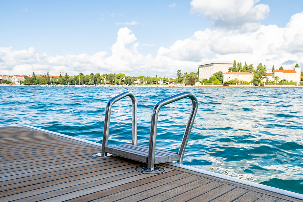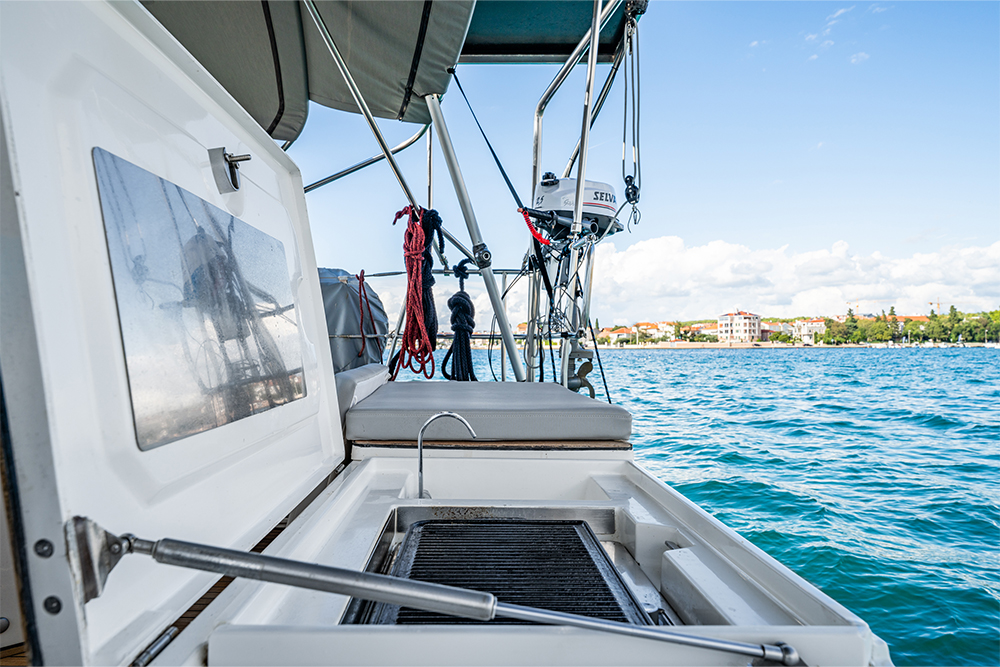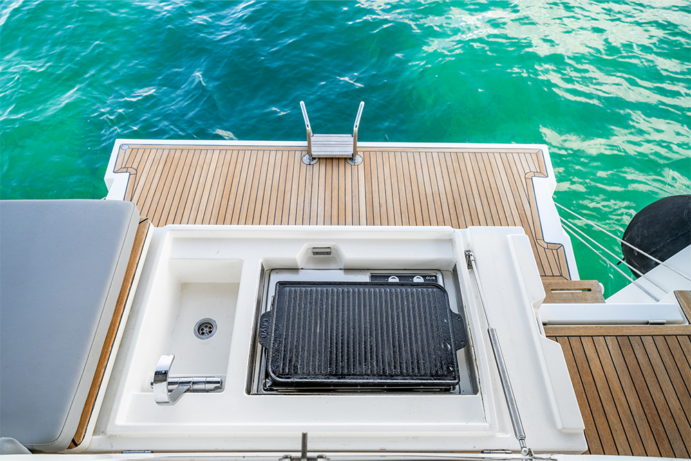 • Wet bar i aktern, integrerad med jollegaraget (inkl. diskho och 20 L lådfrys)