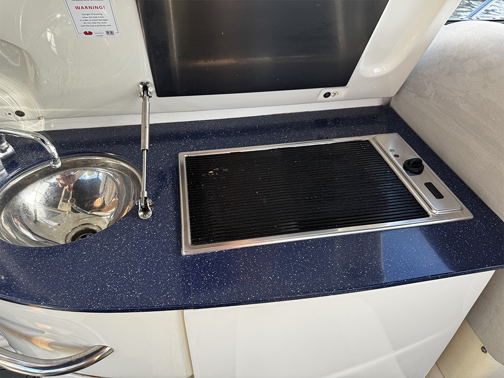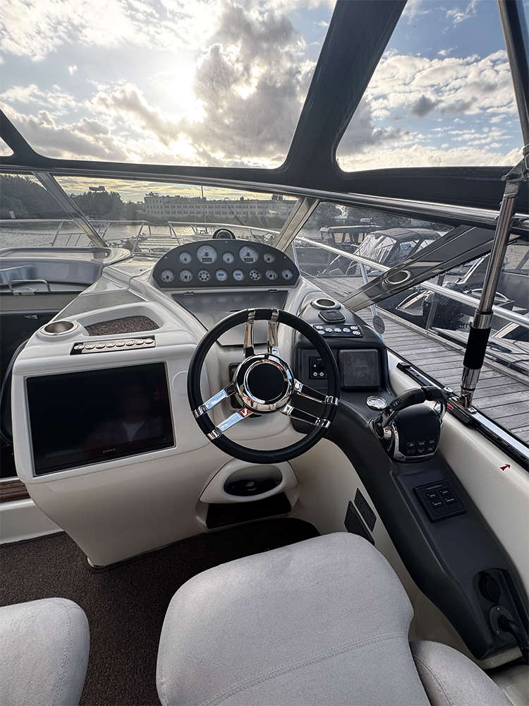 Förarplats med 2 bekväma fåtöljer, på babordsidan ytterligare sittplats.