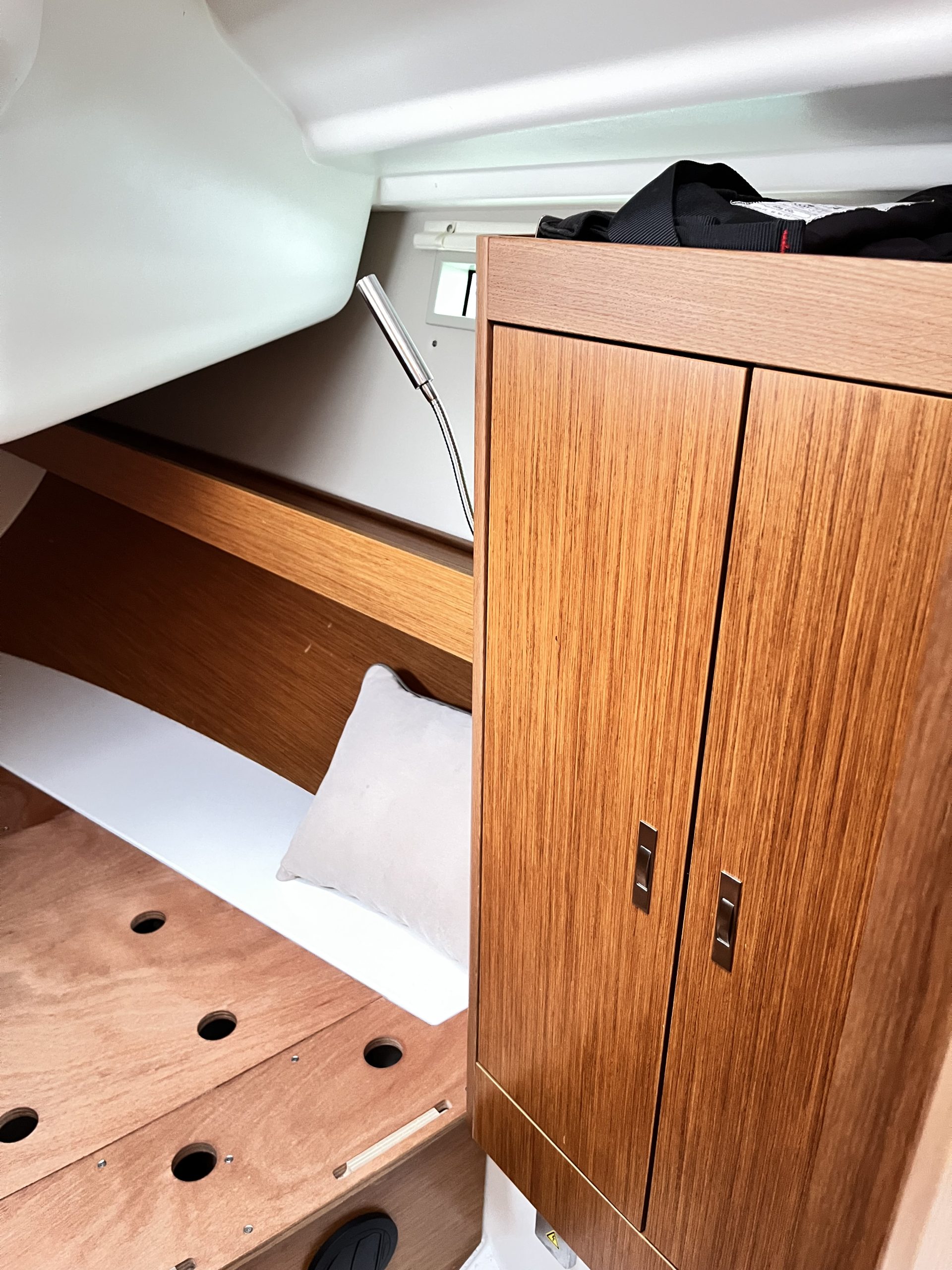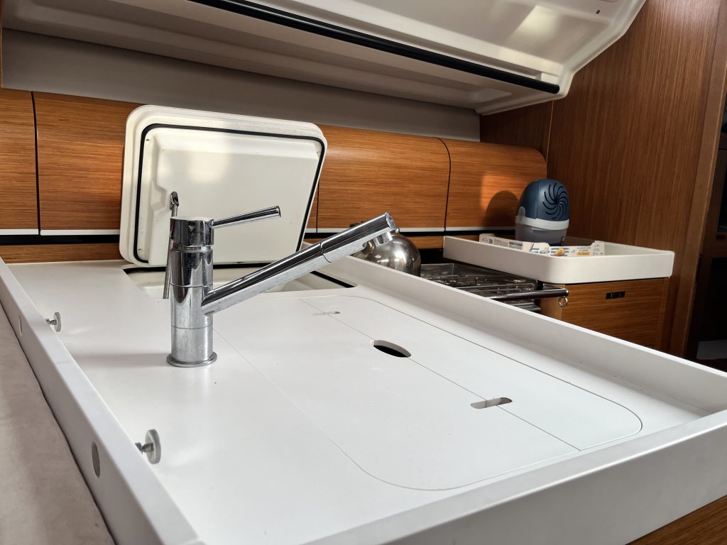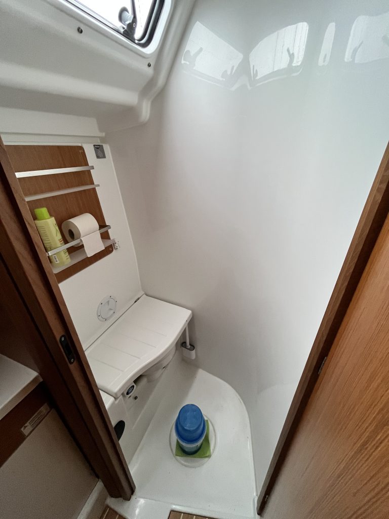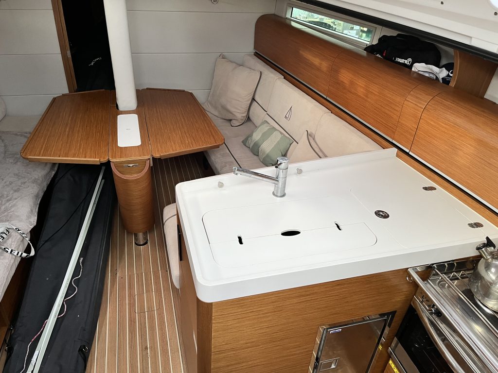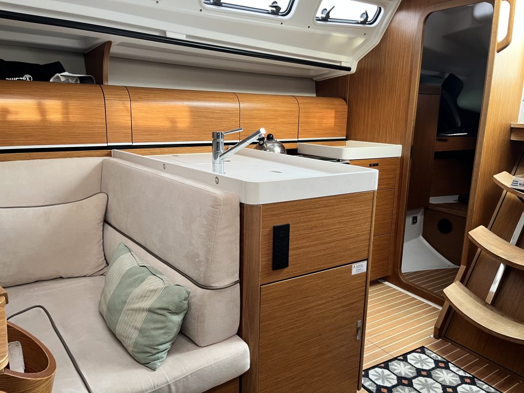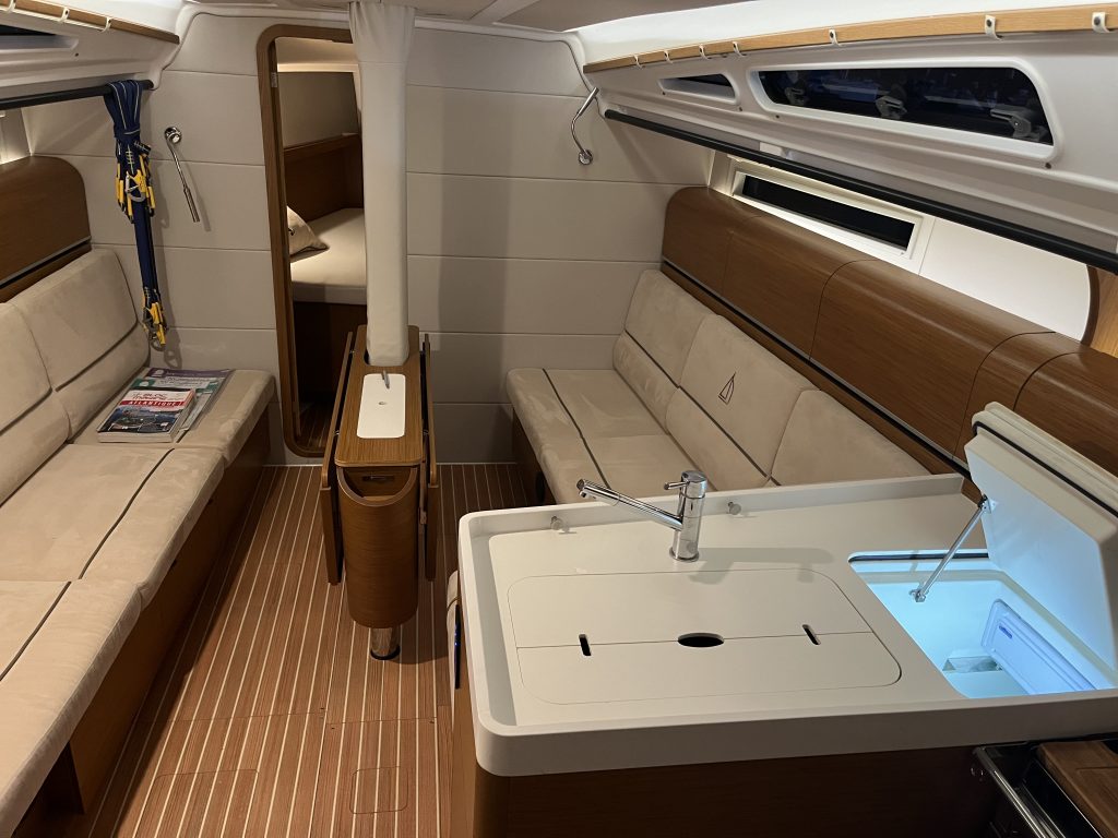 Interiören följer Dehlers välkända linje med fokus på funktion och hållbarhet. Tre kabiner och en rymlig salong ger praktisk användbarhet för både familj och besättning, medan lösningar som UniDoor i våtrummet och genomgående materialval visar att båten är byggd för regelbundet bruk.