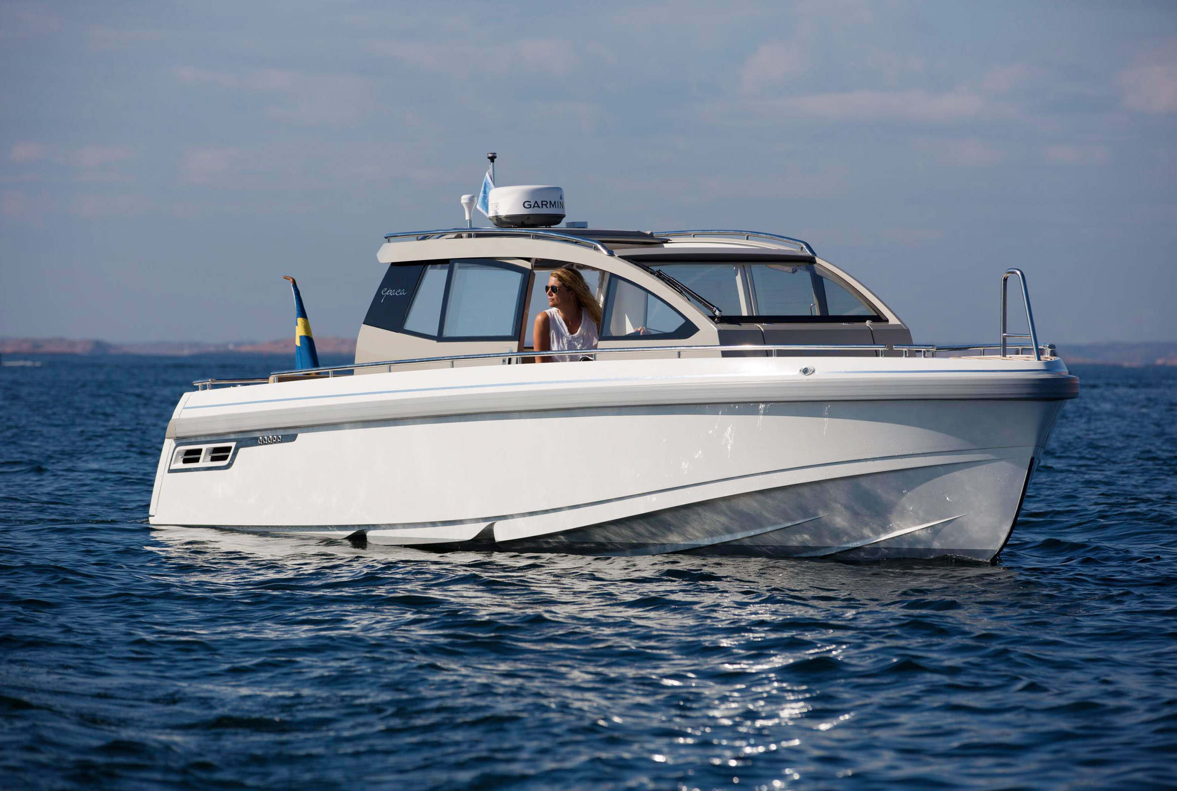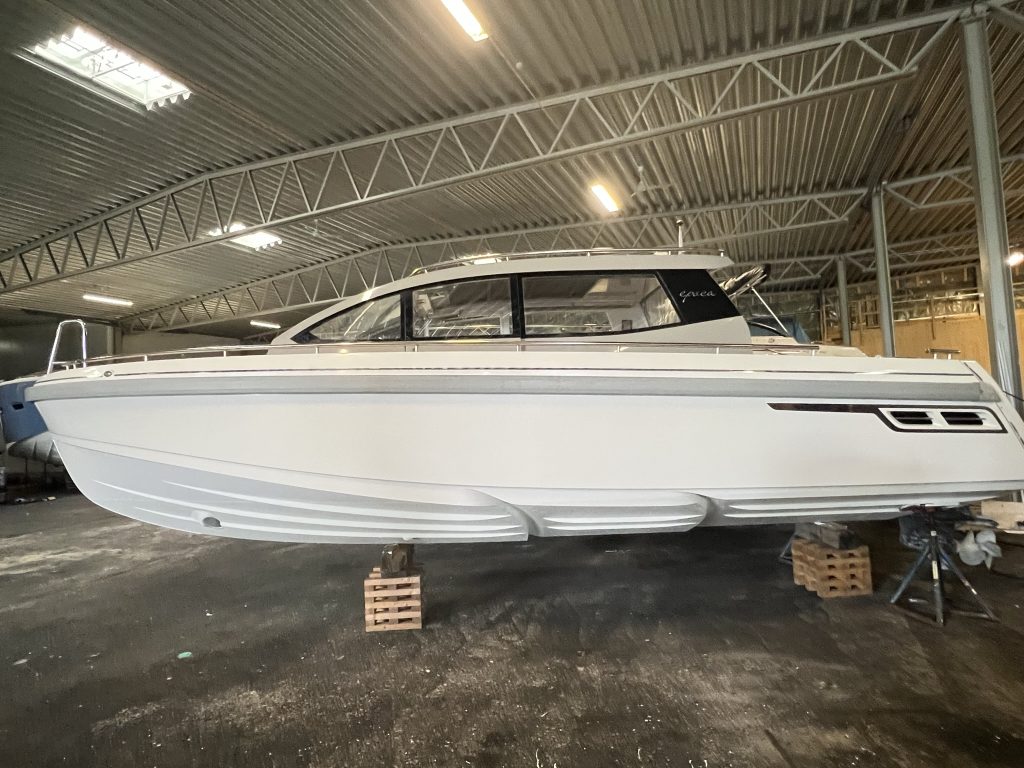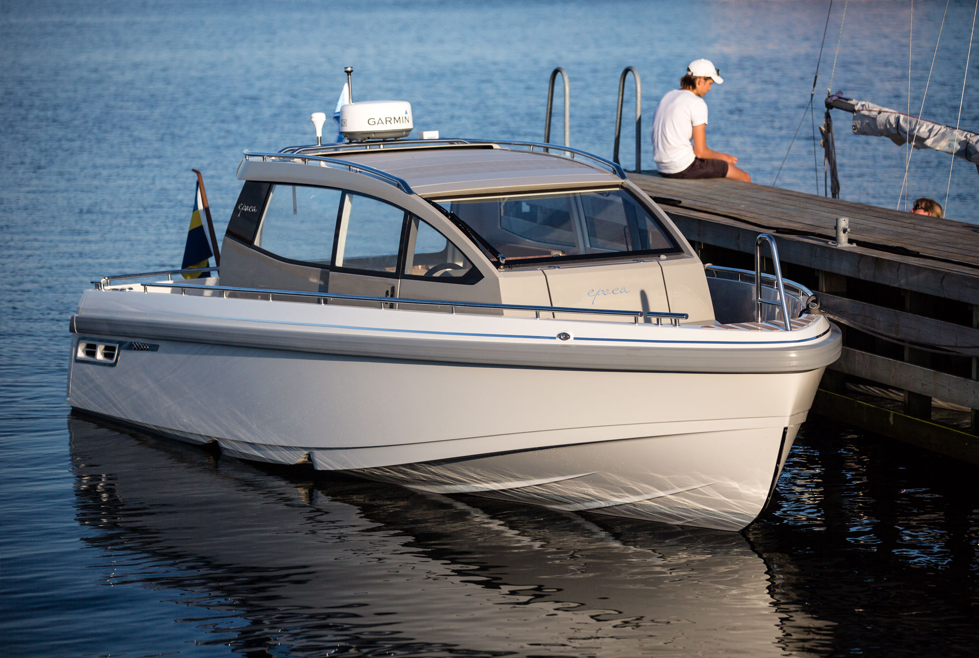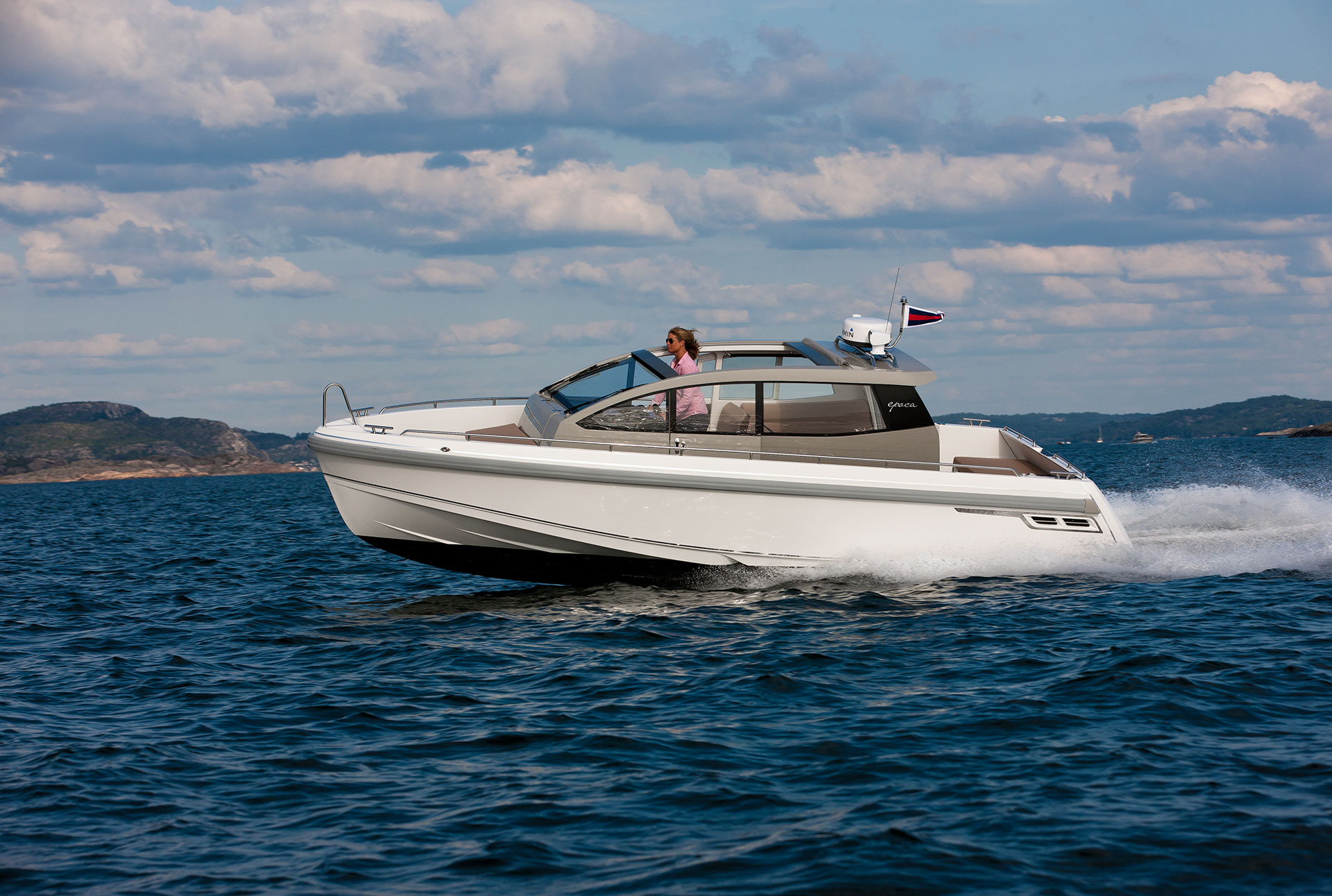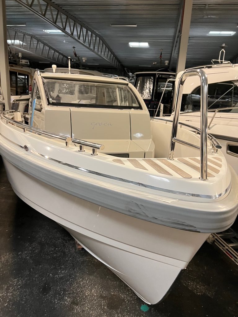 Epoca Coupé erbjuder en lyxig ombonad förarmiljö med bilkänsla. En rymlig coupé med plats för 6 till 8 personer med stort öppningsbart canvastak. Båten har övernattningsmöjlighet för två personer med två meters ligglängd. Dessutom har båten elektriskt fällbar akterspegel, badbrygga med integrerad bad-, och räddningsstege, rymlig ljus toalett med handfat och extra bred avbärarlist. Epoca Coupé är en multifunktionell båt för den moderna familjen samtidigt som den har det där lilla extra i form av omsorgsfullt hantverk och kvalitetskänsla. Möjligheten att köra i alla fartregister med låg planingströskel och sund bränsleekonomi ger en trygg och behaglig känsla för alla ombord. Det är en båt för en, två eller åtta personer i alla åldrar som vill åka, transportera, umgås, sola, bada, fiska, övernatta eller bara njuta av solnedgången. Tack vare att ingången till toaletten går via fördäcket är förarplatsen utformad precis så som vi vill att den skall vara. Det vill säga optimerad för föraren med bra sikt åt alla håll, lagom med instrument och ett stort fastmonterat plotter i mitten. Här njuter du av båtturen och sällskapet utan att bli distraherad.