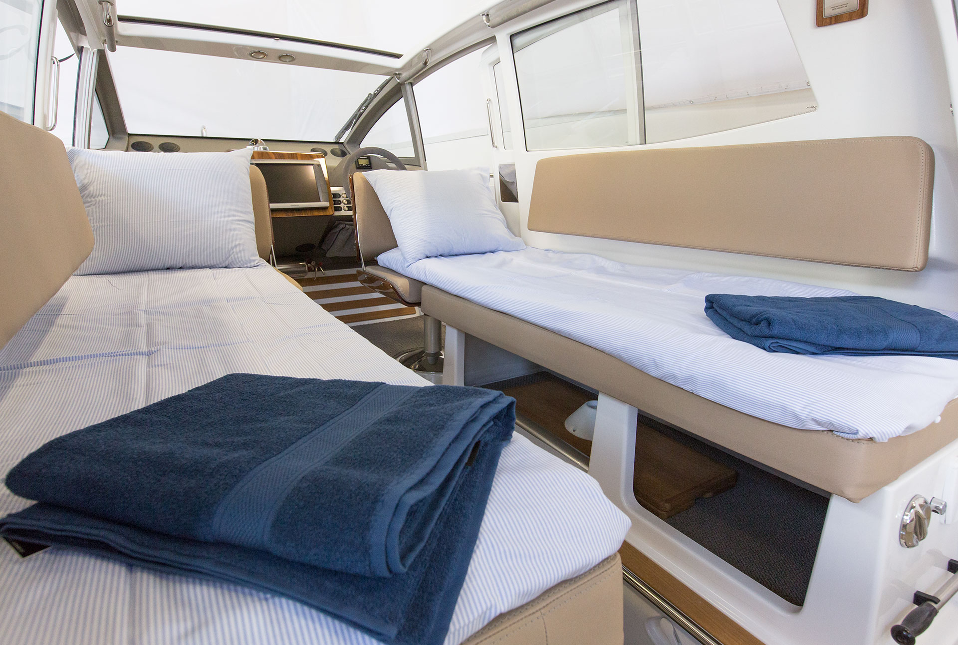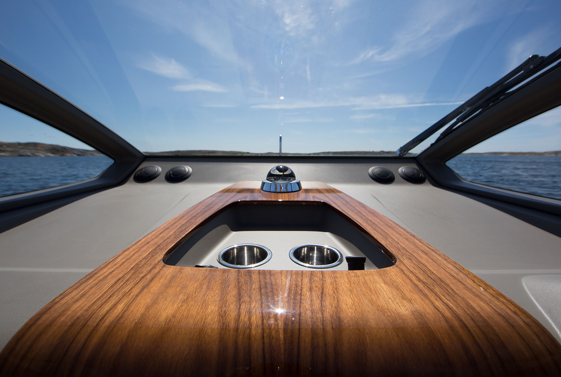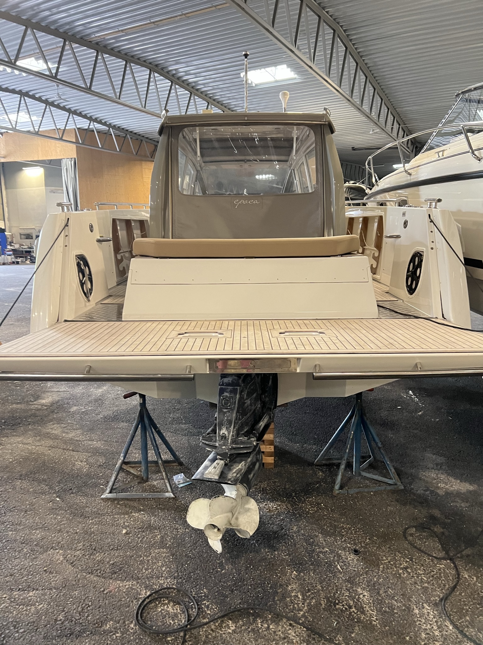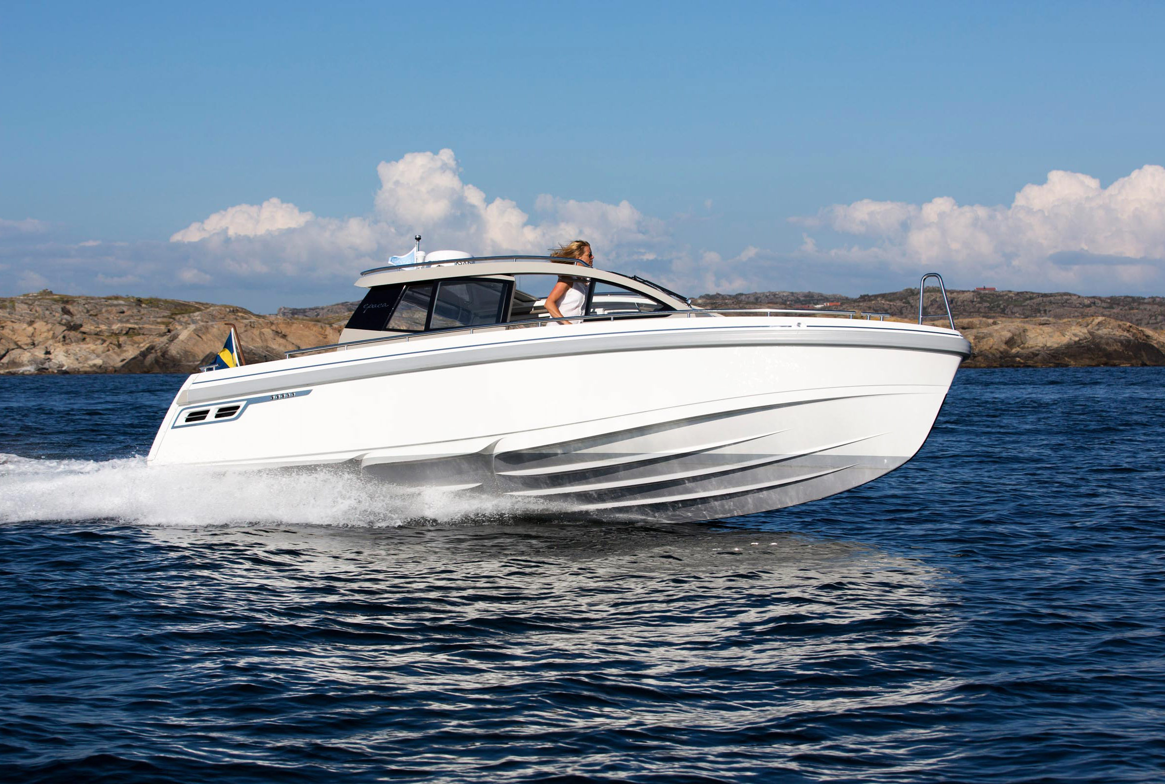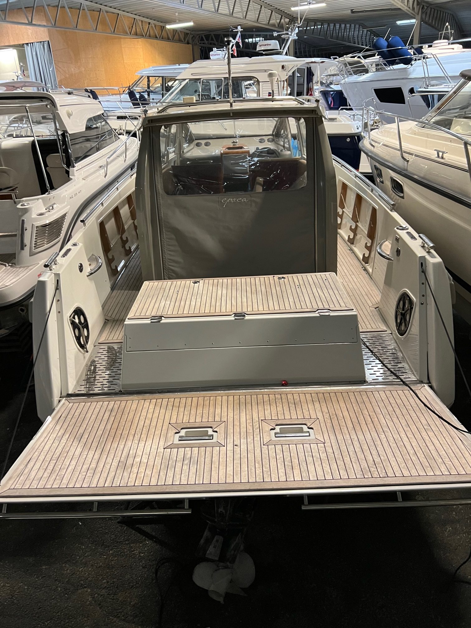 Epoca Coupé erbjuder en lyxig ombonad förarmiljö med bilkänsla. En rymlig coupé med plats för 6 till 8 personer med stort öppningsbart canvastak. Båten har övernattningsmöjlighet för två personer med två meters ligglängd. Dessutom har båten elektriskt fällbar akterspegel, badbrygga med integrerad bad-, och räddningsstege, rymlig ljus toalett med handfat och extra bred avbärarlist. Epoca Coupé är en multifunktionell båt för den moderna familjen samtidigt som den har det där lilla extra i form av omsorgsfullt hantverk och kvalitetskänsla. Möjligheten att köra i alla fartregister med låg planingströskel och sund bränsleekonomi ger en trygg och behaglig känsla för alla ombord. Det är en båt för en, två eller åtta personer i alla åldrar som vill åka, transportera, umgås, sola, bada, fiska, övernatta eller bara njuta av solnedgången. Tack vare att ingången till toaletten går via fördäcket är förarplatsen utformad precis så som vi vill att den skall vara. Det vill säga optimerad för föraren med bra sikt åt alla håll, lagom med instrument och ett stort fastmonterat plotter i mitten. Här njuter du av båtturen och sällskapet utan att bli distraherad.