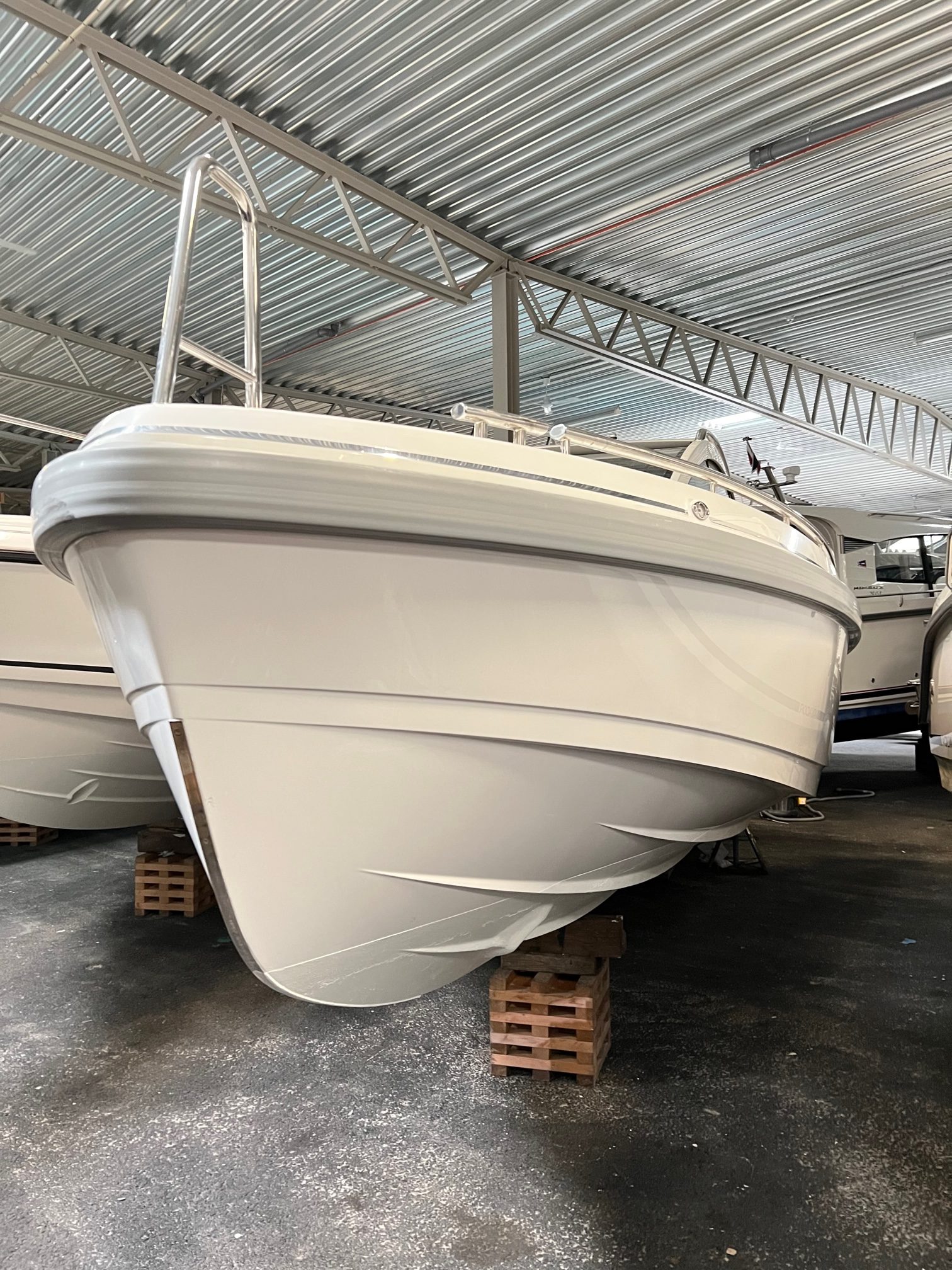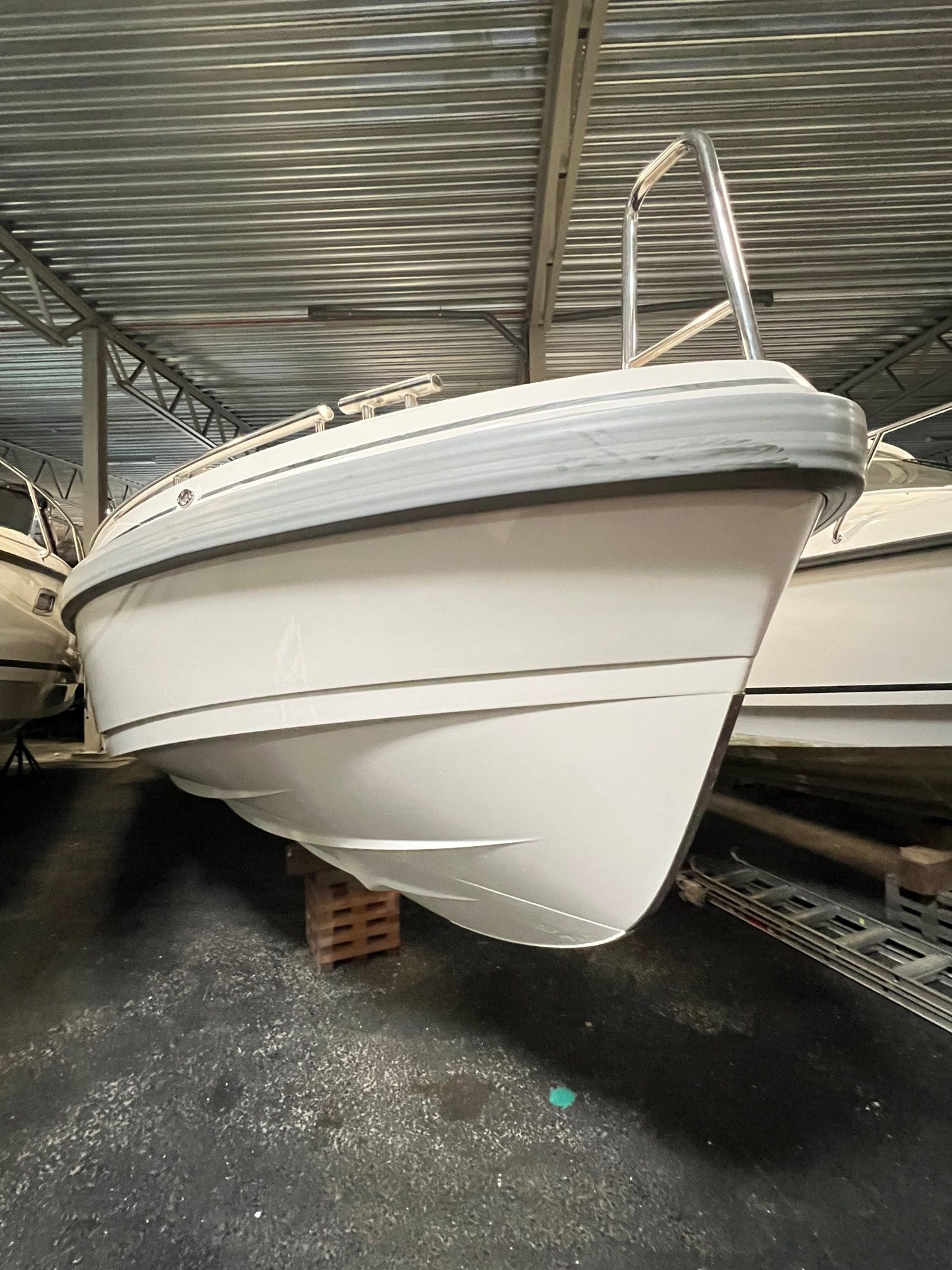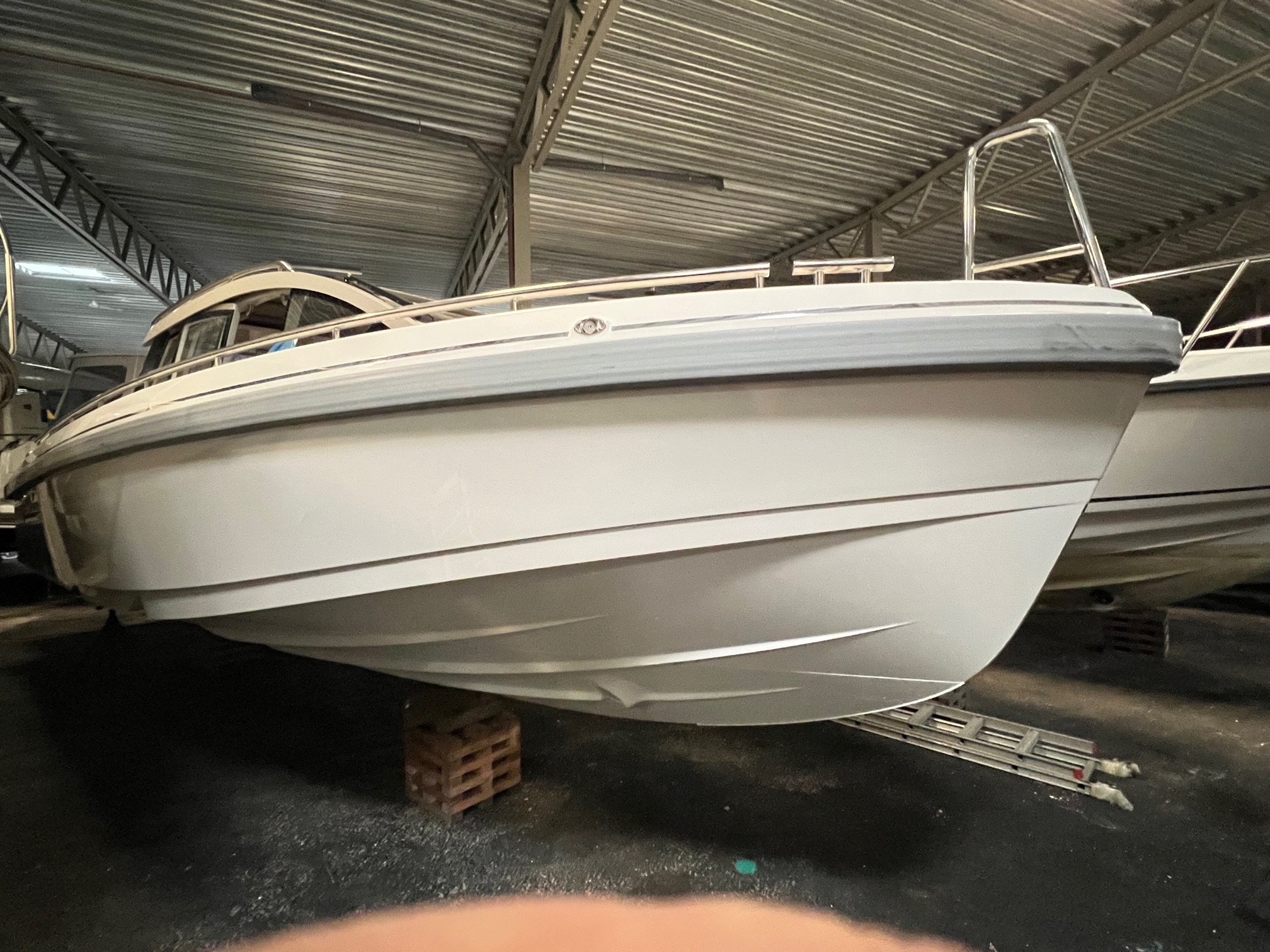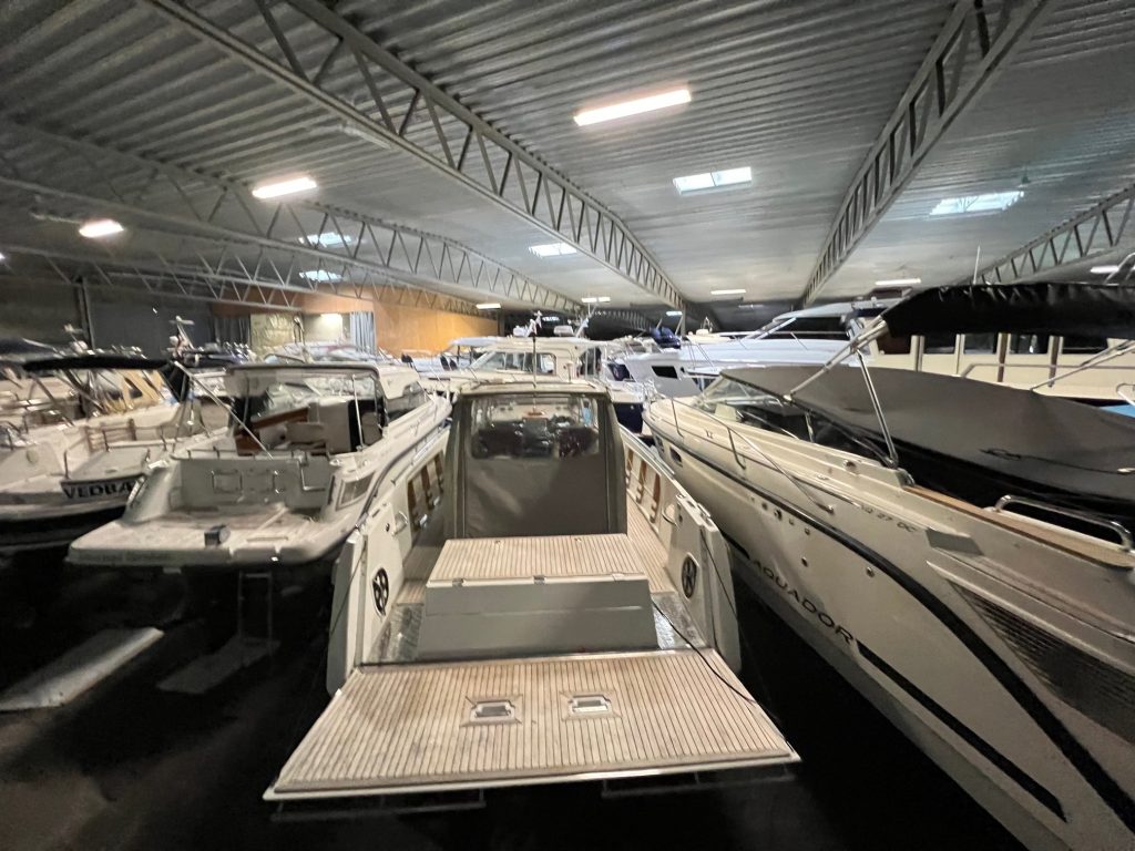 Integrerad fenderhållare i skrovsida med fendrar och hållare för båtshake