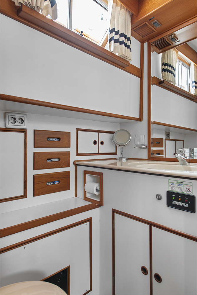 • Gäst kabin: Förlig rymlig V-koj twinbeds. Bra garderob och inbyggd förvaring.