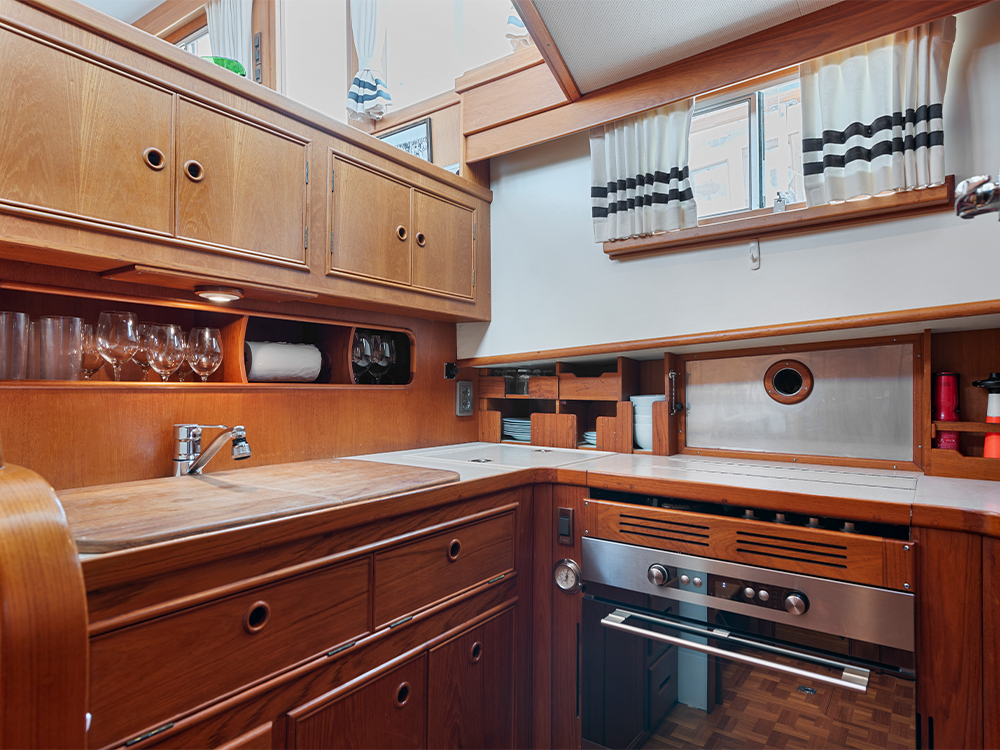 • Salong: Stor och öppen, med handgjord burmesisk teakinredning, ny klädsel (2023), en L-formad soffa, två loungestolar och en isotherm vinkylare. Stort matbord som hydrauliskt omvandlas till ett stiligt soffbord.