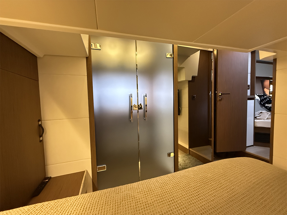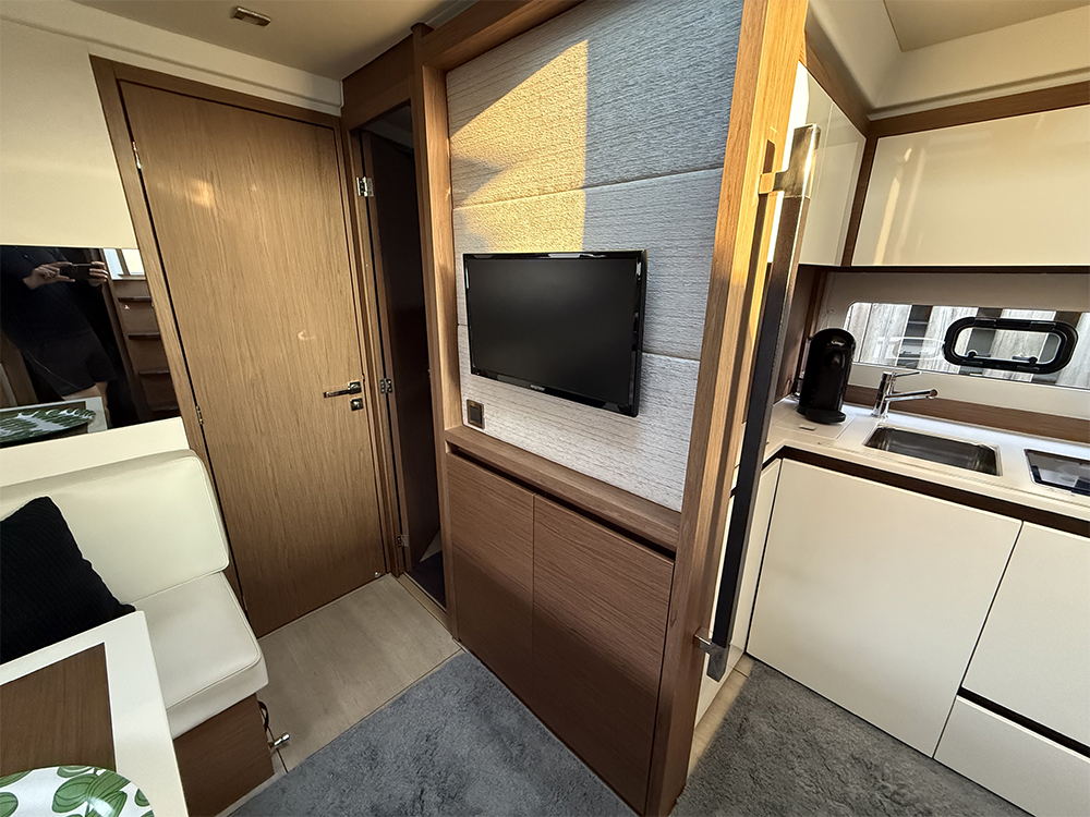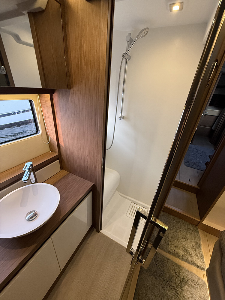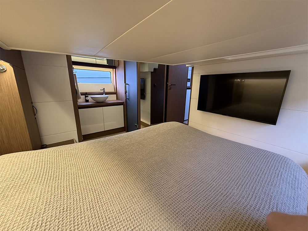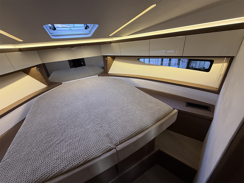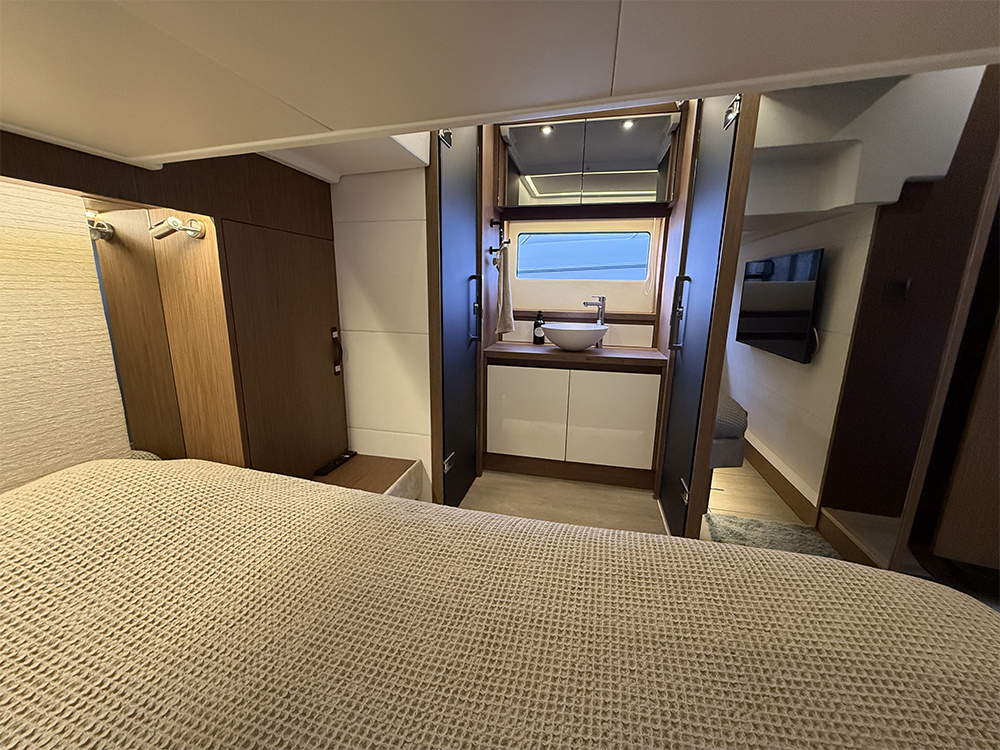 Interiört finns två generösa kabiner, båda med dubbelsängar och varsitt separat badrum med elektrisk toalett och duschkabin. Pentryt är fullt utrustat med kombiugn/micro, induktionshäll, kyl/frys samt en praktisk wetbar i sittbrunnen med ismaskin och ytterligare kyl.