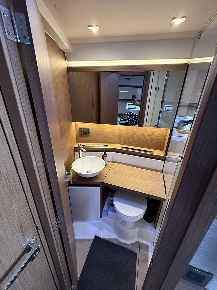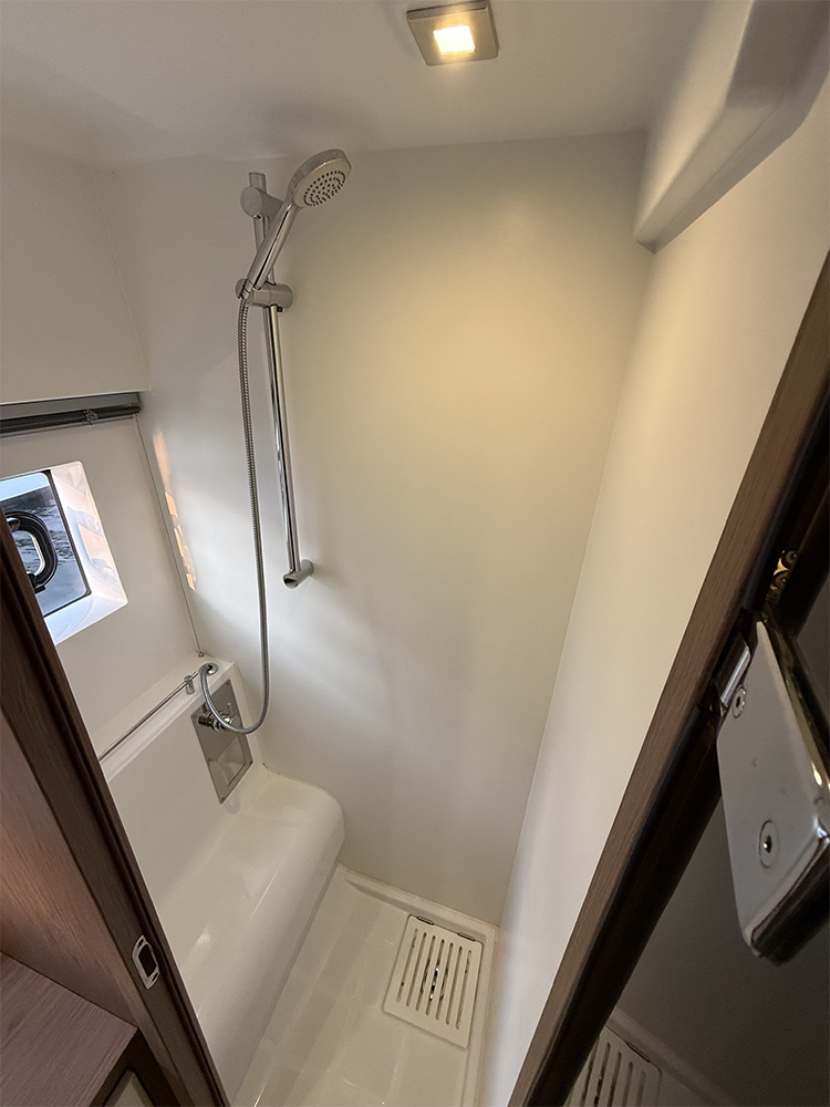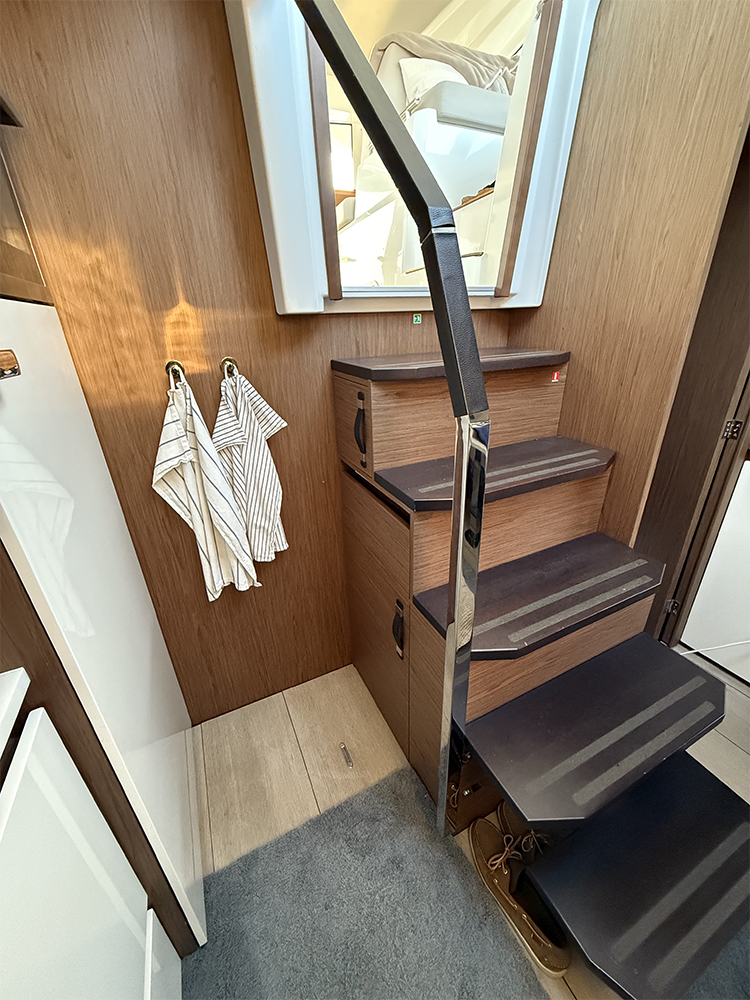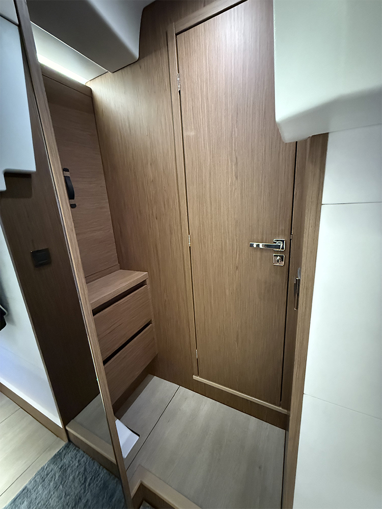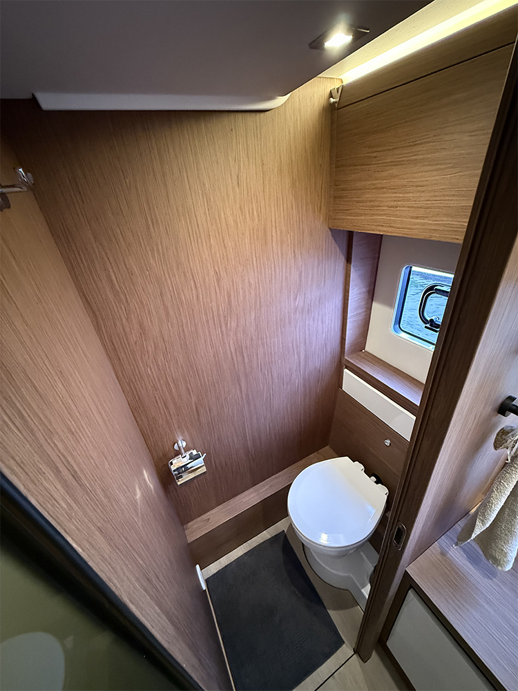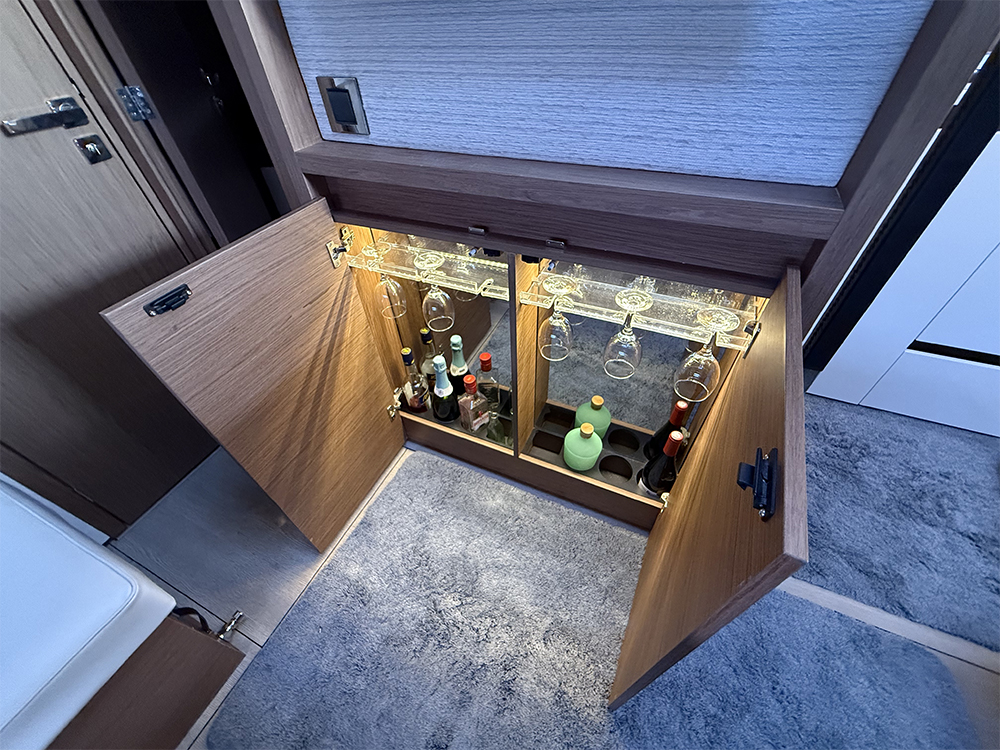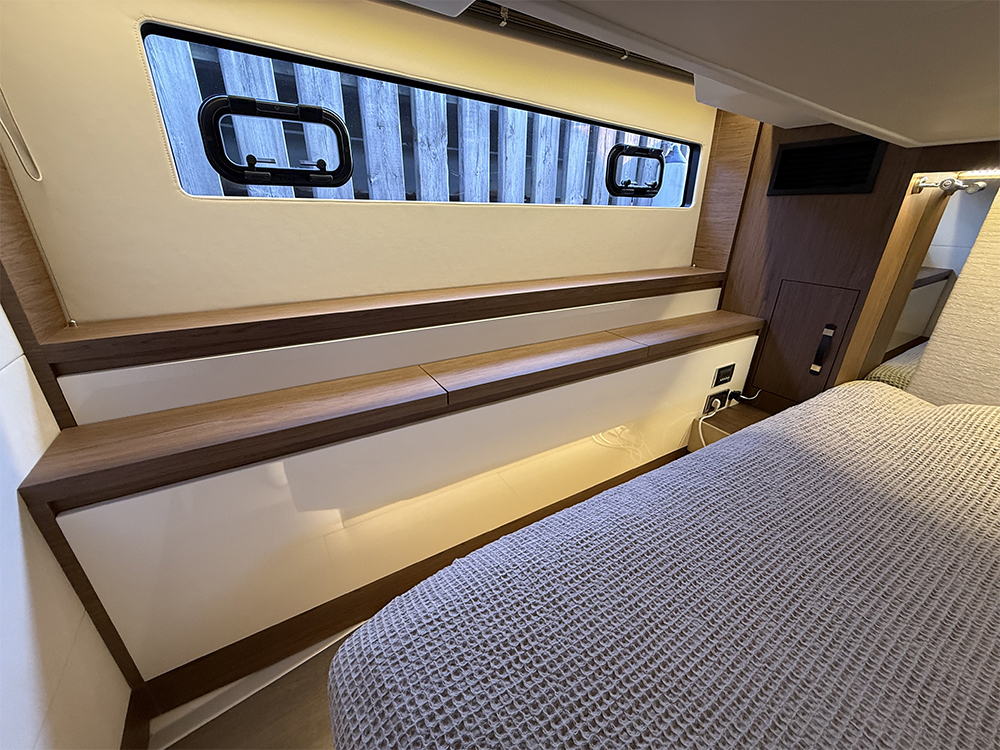 Interiört finns två generösa kabiner, båda med dubbelsängar och varsitt separat badrum med elektrisk toalett och duschkabin. Pentryt är fullt utrustat med kombiugn/micro, induktionshäll, kyl/frys samt en praktisk wetbar i sittbrunnen med ismaskin och ytterligare kyl.