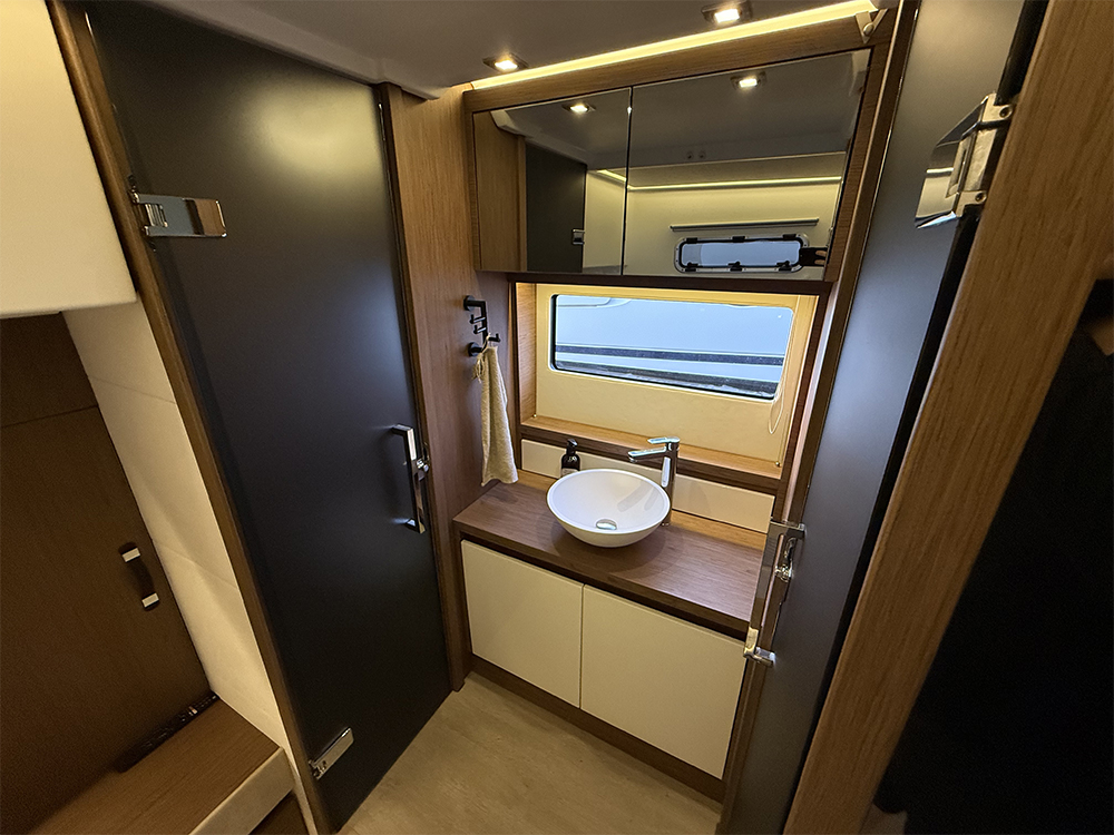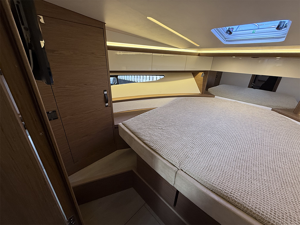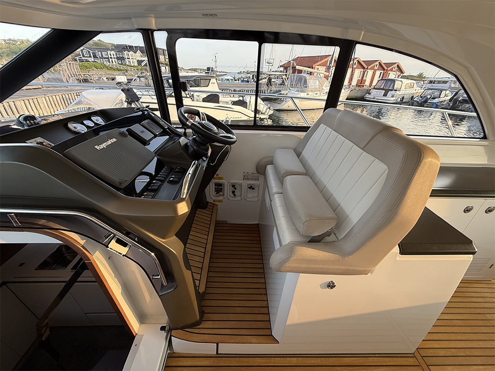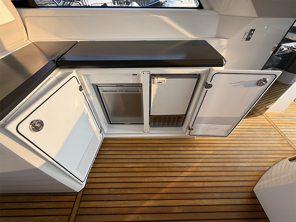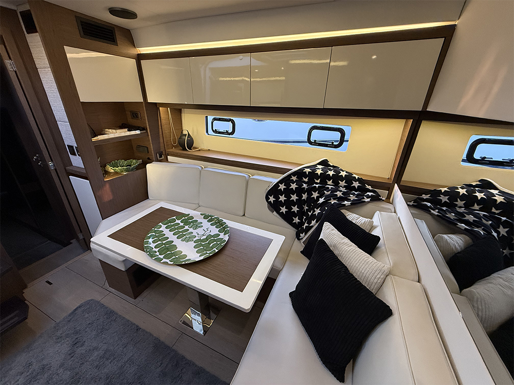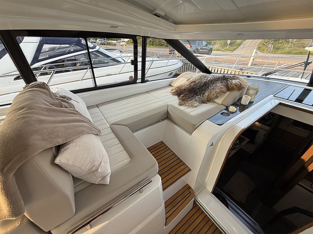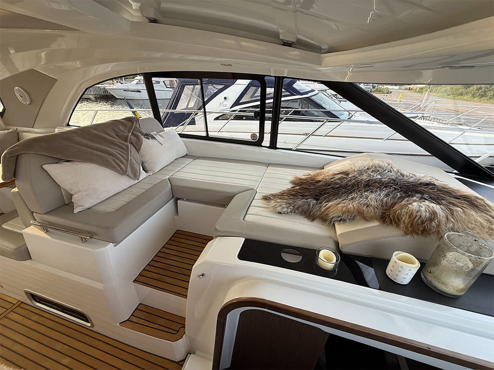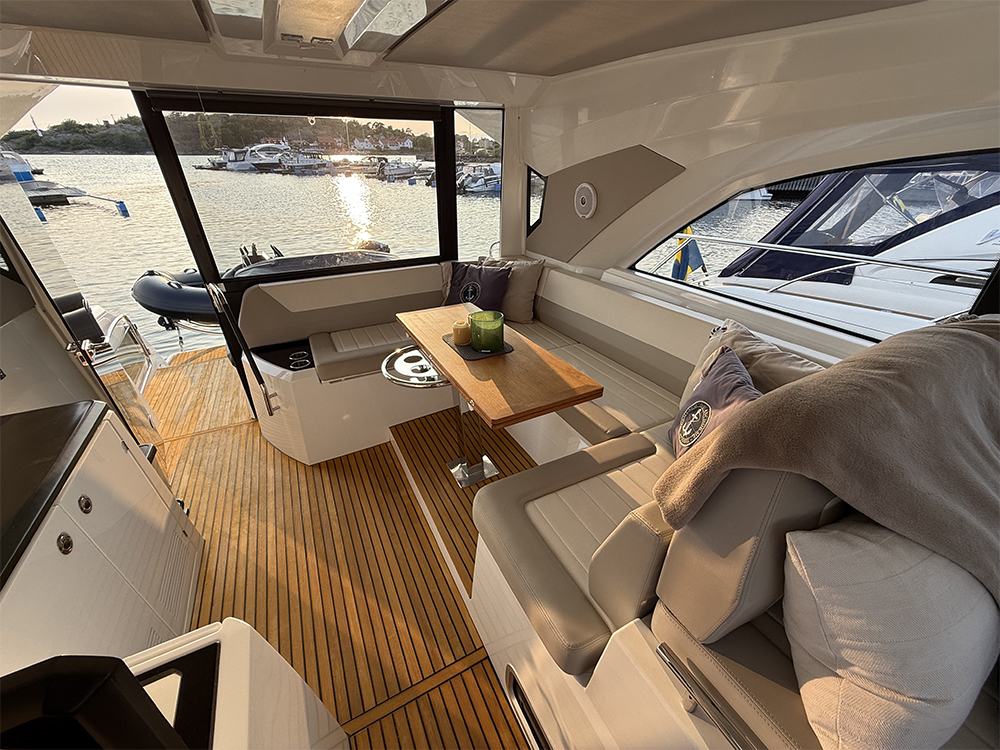 Båten erbjuder ett öppet och socialt layoutkoncept med elektriskt öppningsbart soltak, bred gångdörr och ett öppningsbart fönster mot sittgruppen på akterdäck – vilket skapar en sömlös övergång mellan ute och inne.
