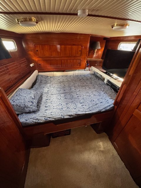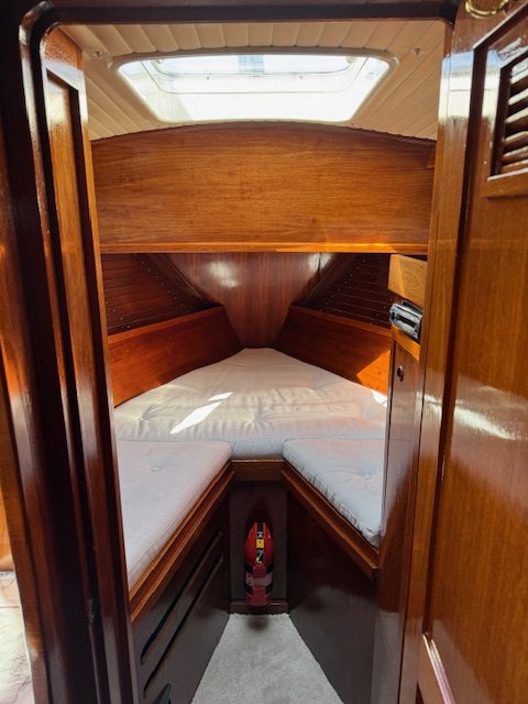 Elektronikken er moderniseret med plottere fra både Raymarine og Simrad, Furuno-system til autopilot, radar og VHF samt et Victron-baseret elsystem med solenergi, inverter og opgraderede batterier. Den ombyggede agterkahyt med stor dobbeltseng og Tempur-madrasser giver en komfort, der er usædvanlig i både af denne generation.
