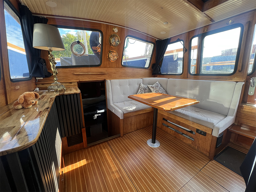 Interiøret er præget af solidt træarbejde og opdaterede materialevalg, hvor blandt andet nye hynder, tæpper, gardiner og belysningsløsninger bidrager til en hyggelig og tidløs atmosfære.