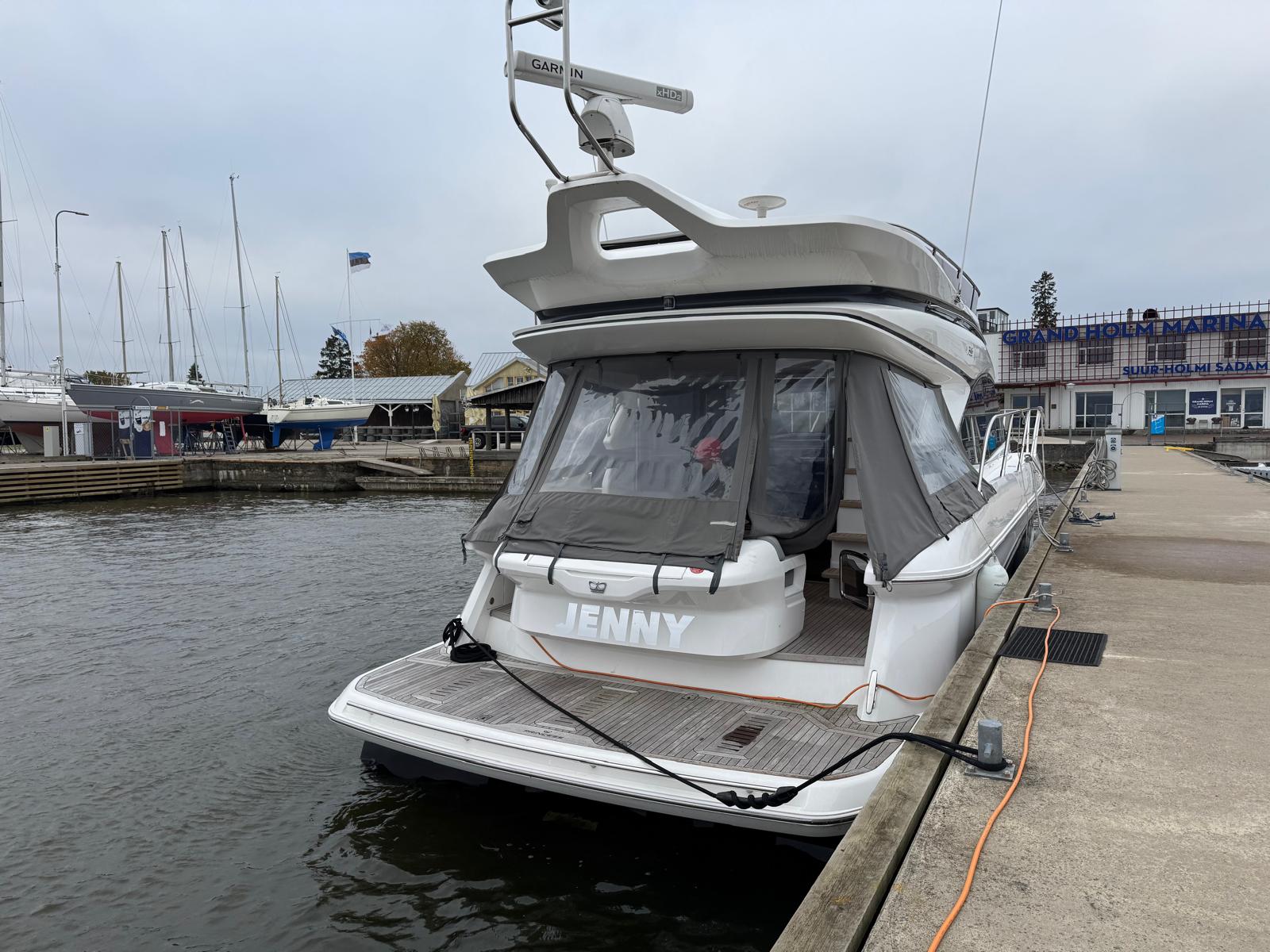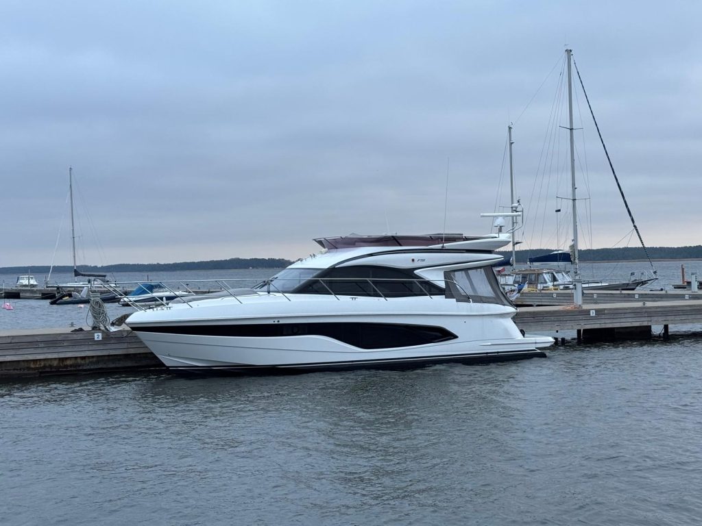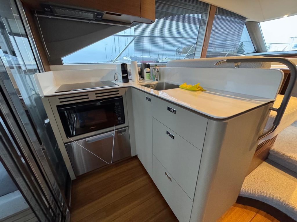Udvendigt tilbyder båden teakbelagte dæk, flybridge med wetbar, elgrill og køleboks, solsenge både forude og agterude samt en elektrohydraulisk badeplatform med 400 kg løftekapacitet – perfekt til en jolle eller vandscooter. Undervandsbelysning, gråt kaleche og rustfri detaljer giver et eksklusivt helhedsindtryk.