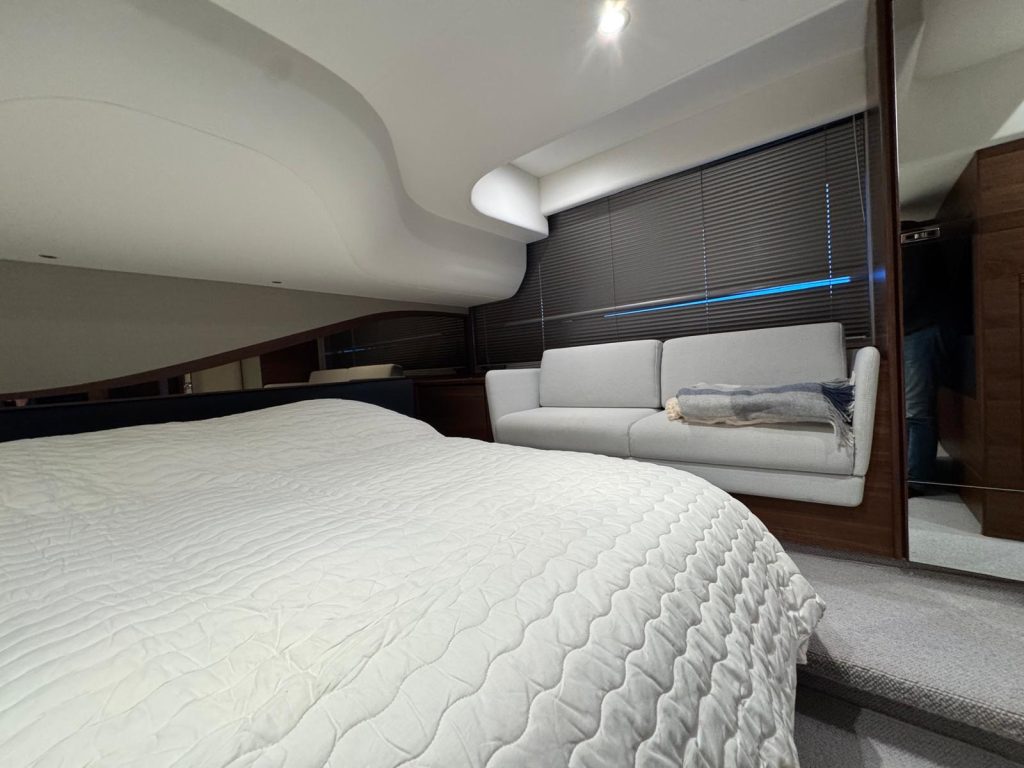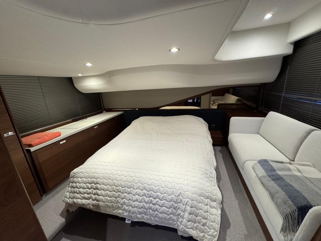 Interiøret er lyst, moderne og smagfuldt indrettet med materialer af høj kvalitet. Her er to rummelige kabiner med egne badeværelser, fuldt udstyret pantry, generøse opholdsområder og flere TV- og lydsystemer fra NAIM. Den åbne salon og flybridge skaber en herlig følelse af rummelighed og kontakt med havet, mens funktioner som aircondition, opvaskemaskine og elektrisk sofa i cockpittet bidrager til den højeste komfort ombord.