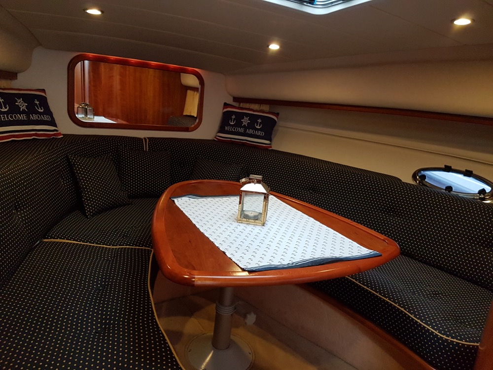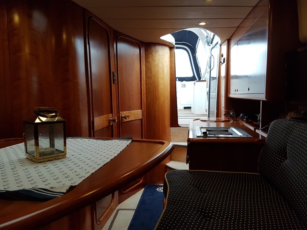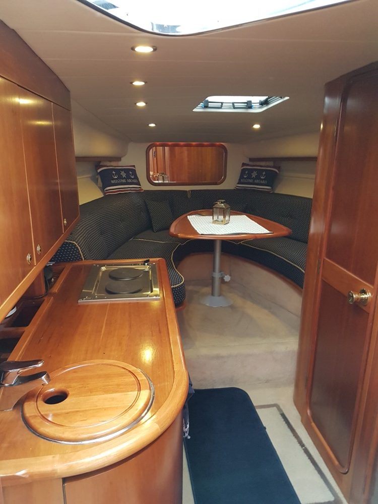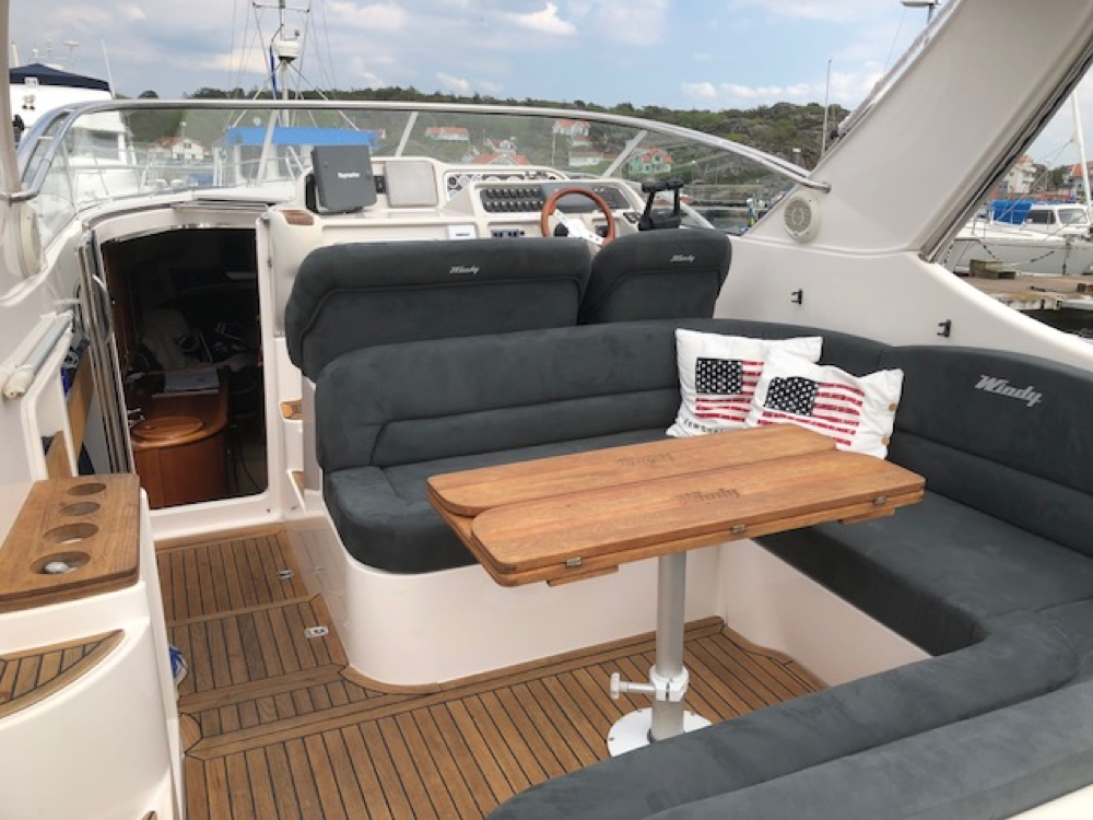 Windy 32 – 1998 is a large and open day cruiser that offers good accommodation for 4 people. Mid-cabin and a spacious convertible V-berth. The boat has a toilet (holding tank) with shower, galley, fine teak deck, and a really spacious cockpit where many can gather at the same time. In bad weather, the canopy covers the entire cockpit (standing height).