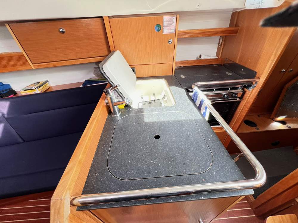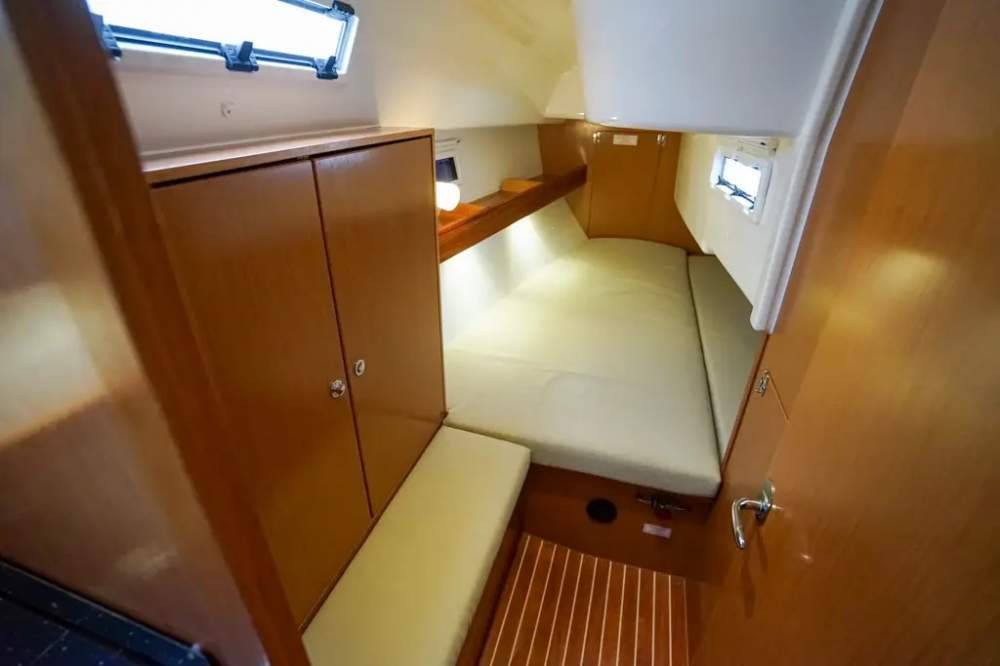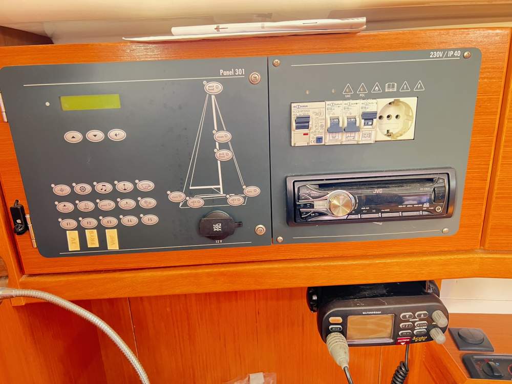 Två hytter, totalt 4+2 kojplatser, ljus salong, välplanerat pentry och toalett med dusch skapar ett trivsamt och funktionellt hem till sjöss. Volvo Penta D1-20 dieselmotor på 18 hk med endast ca 541 timmar. Bränsle- och vattentankar på 150 liter vardera. Skrov och däck i glasfiber (GRP).