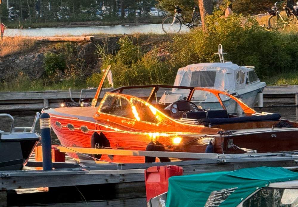 Detta exemplar är i mint condition och har omsorgsfullt vårdats och servats av Djurövarvet. Båten har vinterförvarats i kallhall och levereras med full dokumentation. Ombord finns ett välplanerat pentry med varm- och kallvatten, spis samt utdragbart kylskåp i rostfritt stål. Ruffen erbjuder en bekväm V-koj med extra dyna, generösa stuvutrymmen och elektrisk toalett. Akterdäcket präglas av en stor badplattform med stege och elektriskt ankarspel – perfekt för både badliv och enkel tilläggning.