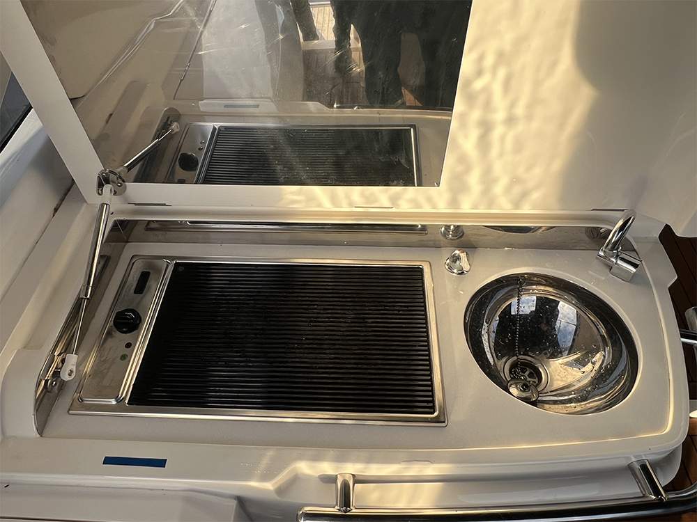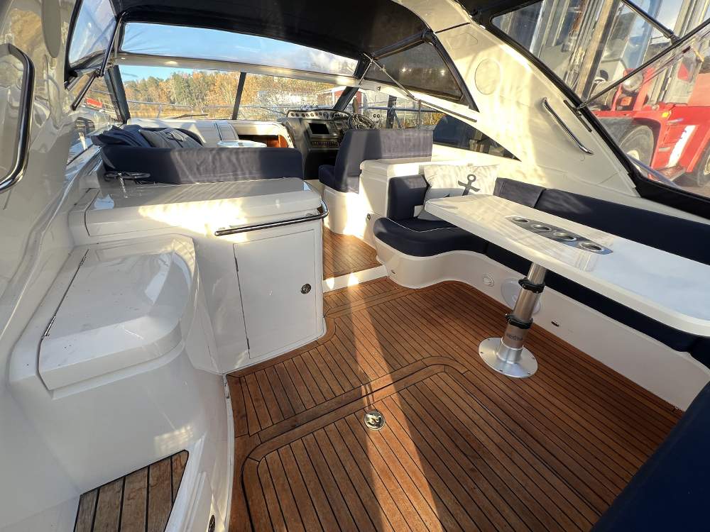 Med dubbla Volvo Penta D6-350 dieselmotorer och både bog- och akterpropeller manövreras båten enkelt i trånga hamnar och levererar en stabil, tyst och behaglig gång även i marschfart. Sittbrunnen är rymlig och socialt planerad med stor sittgrupp, wetbar och utekök – en naturlig samlingsplats under färd och vid förtöjning. Under däck möts du av två kabiner, ett välplanerat pentry och en inredd salong med ljusa materialval och god komfort, kompletterat av luftvärmare och varmvattenberedare för säsongsförlängning.